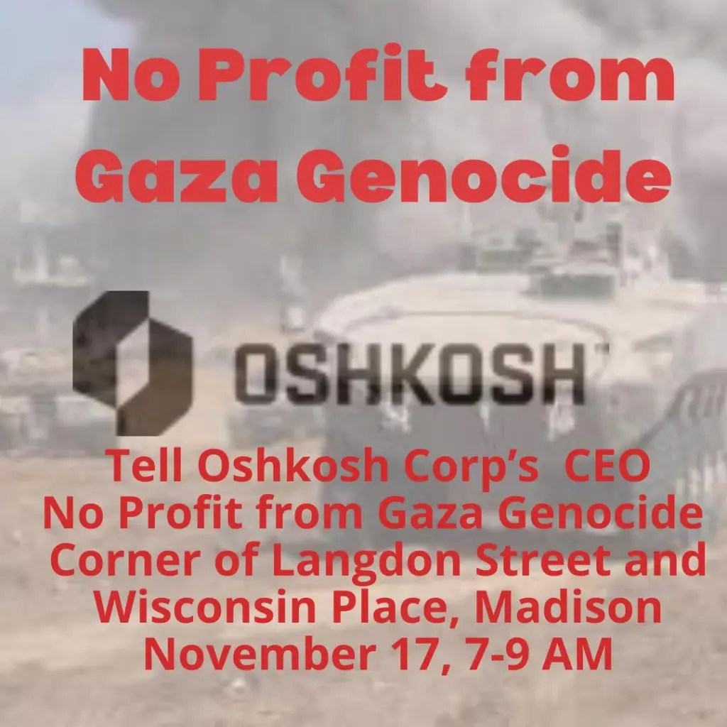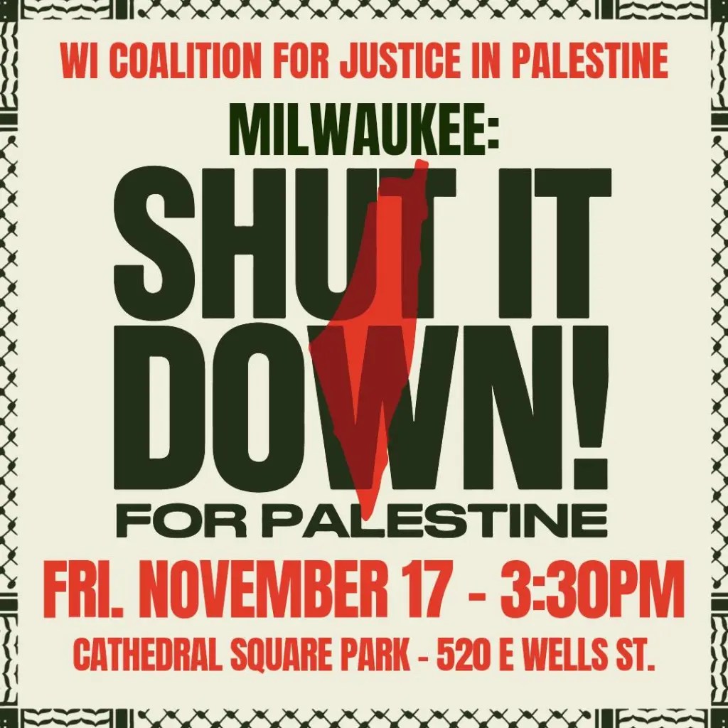 Categories Uncategorized Wisconsin: Free Palestine! Actions November 15-19, 2023 (Listings) Post author By wibailoutpeople Post date November 14, 2023 Wisconsin: Free Palestine! Actions November 15-19, 2023 (Listings) Madison-Rafah Sister City Project Share this: Share on X (Opens in new window) X Share on Facebook (Opens in new window) Facebook Like Loading... Related ← Mexican president says he will require freight rail operators to offer passenger service → Activists Just Shut Down a Factory That Makes Parts for Israeli Fighter Jets