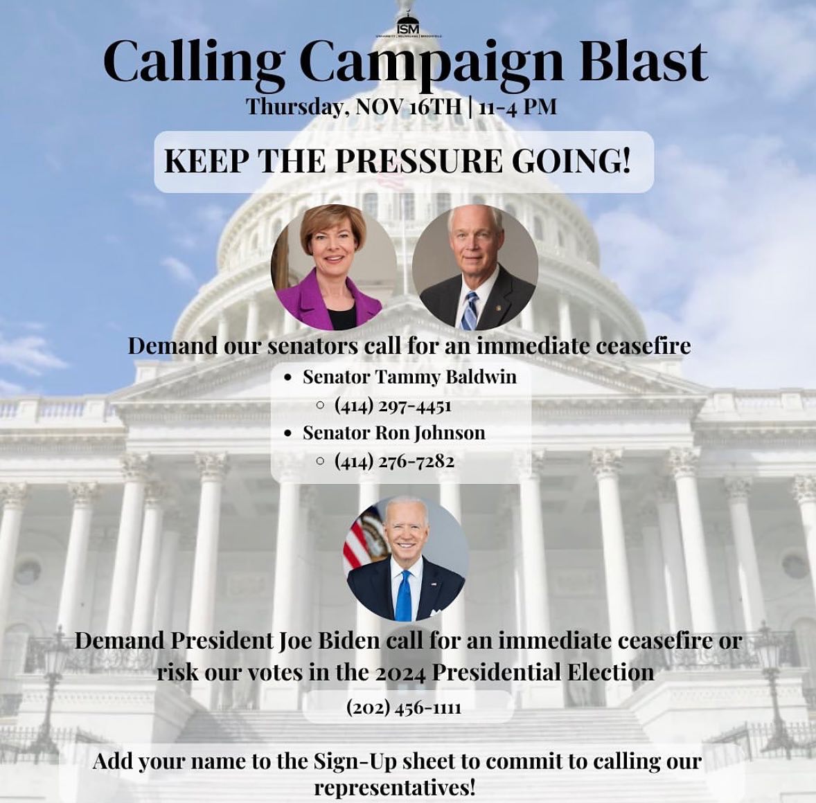 1. As a constituent I am calling to request that the Senator/Representative call for a ceasefire immediately. There have been more than 11,000 innocent civilians killed by Israel and counting. This is not defense it is a genocide. The senator/representative must act to stop more deaths. This has been a campaign of collective punishment and disproportionate use of force.