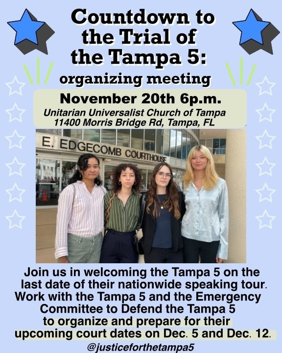 | On Nov. 20th, at 6pm at the Unitarian Universalist Church of Tampa, the Tampa 5 will give a report from the tour, their case, and discuss preparations to organize around their trial and to defend students’ freedom of speech in the era of DeSantis. |