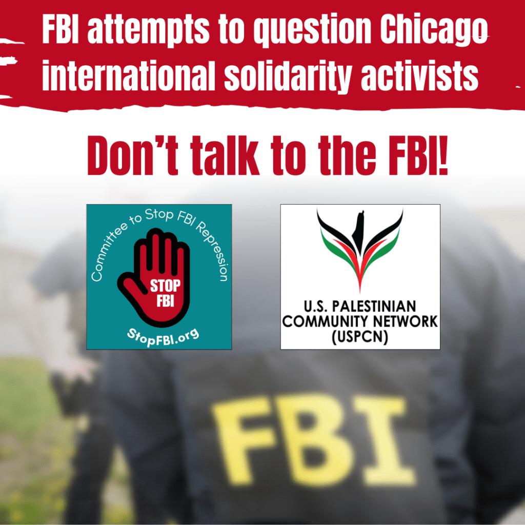 The Committee to Stop FBI Repression (CSFR) and the US Palestinian Community Network (USPCN) do not know exactly what this FBI investigation is about. We do know this: the FBI is the political police for the ruling class, and it is constantly threatening our movement.