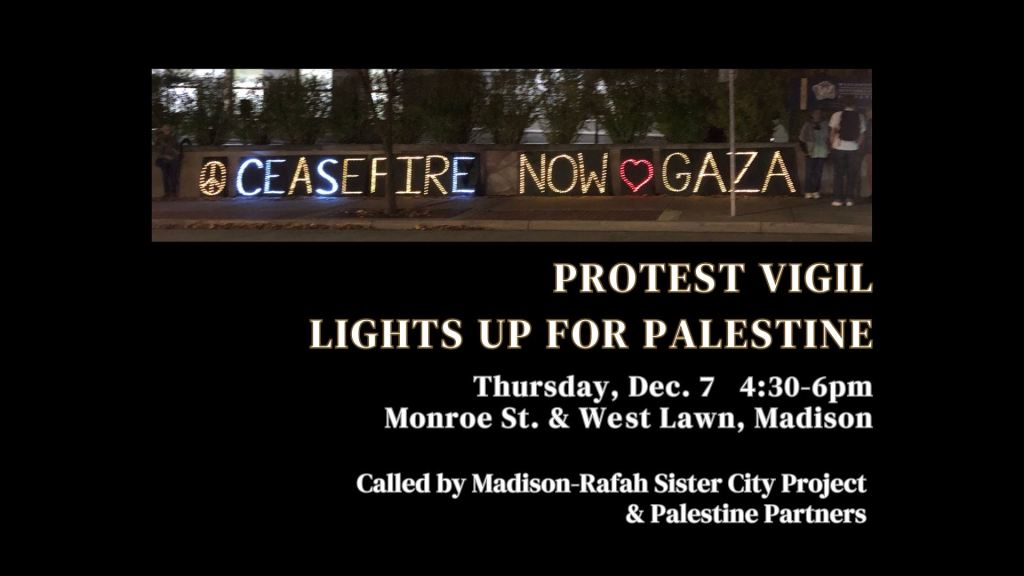 Categories Uncategorized Madison, December 7, 2023: Protest Vigil – Lights Up for Palestine! Post author By wibailoutpeople Post date November 21, 2023 Event: https://fb.me/e/7LsWcC0LJ Madison-Rafah Sister City Project Share this: Share on X (Opens in new window) X Share on Facebook (Opens in new window) Facebook Like Loading... Related ← Top 11 Companies Supporting Israel’s Crimes | America Inc. w/ Lee Camp → Milwaukee, November 24, 2023: Shut It Down for Palestine! (Press Release)
