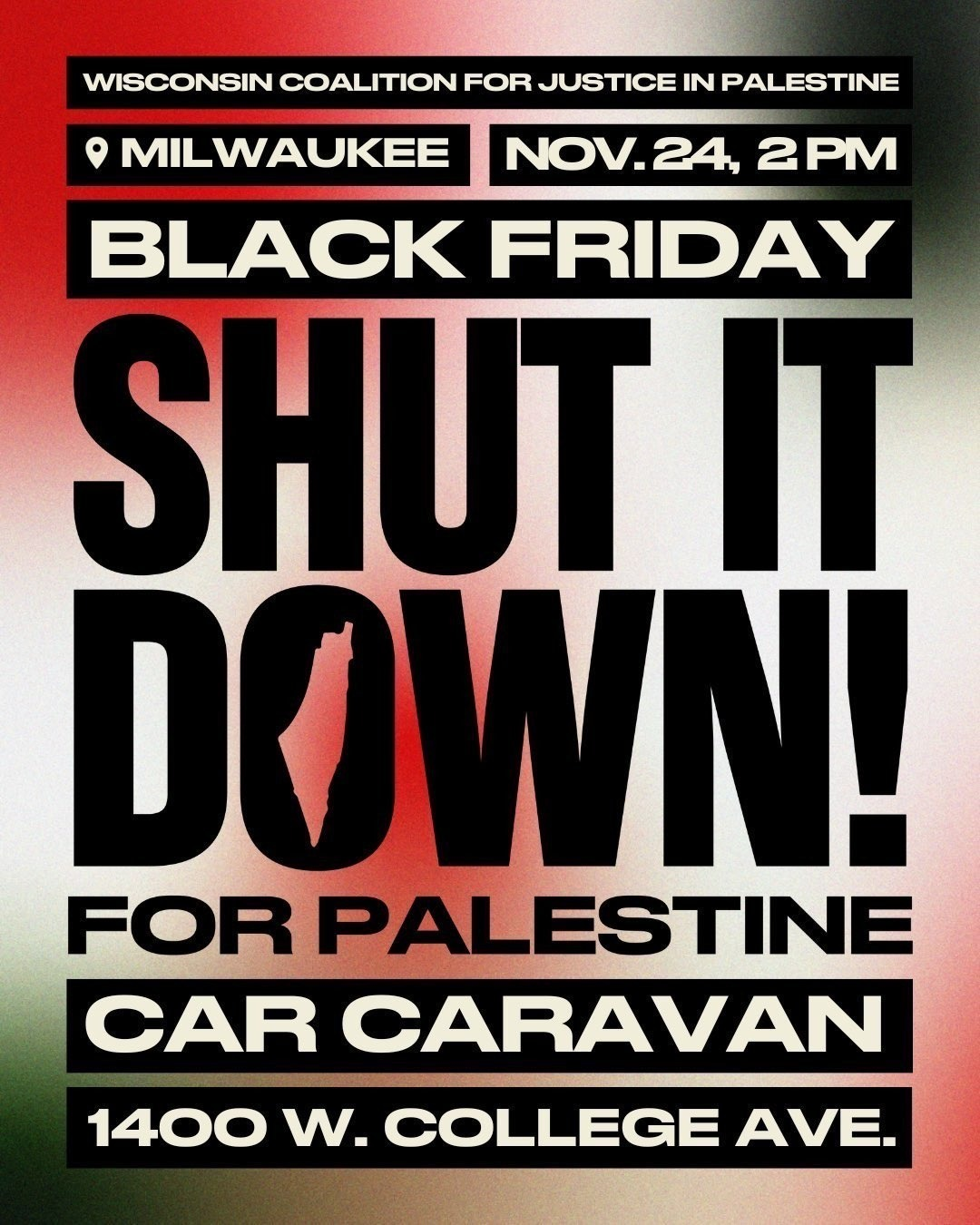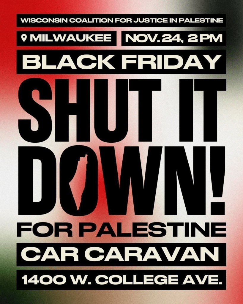 As part of the national Shut it Down for Palestine campaign, at least 150 vehicles from the WI Coalition will caravan across Milwaukee on November 24. Colorfully decorated vehicles led by a digital ad truck will blanket the city with a message of peace and solidarity with Palestinians. Video of the caravan taken from a hovering drone will be available shortly after the caravan finishes.