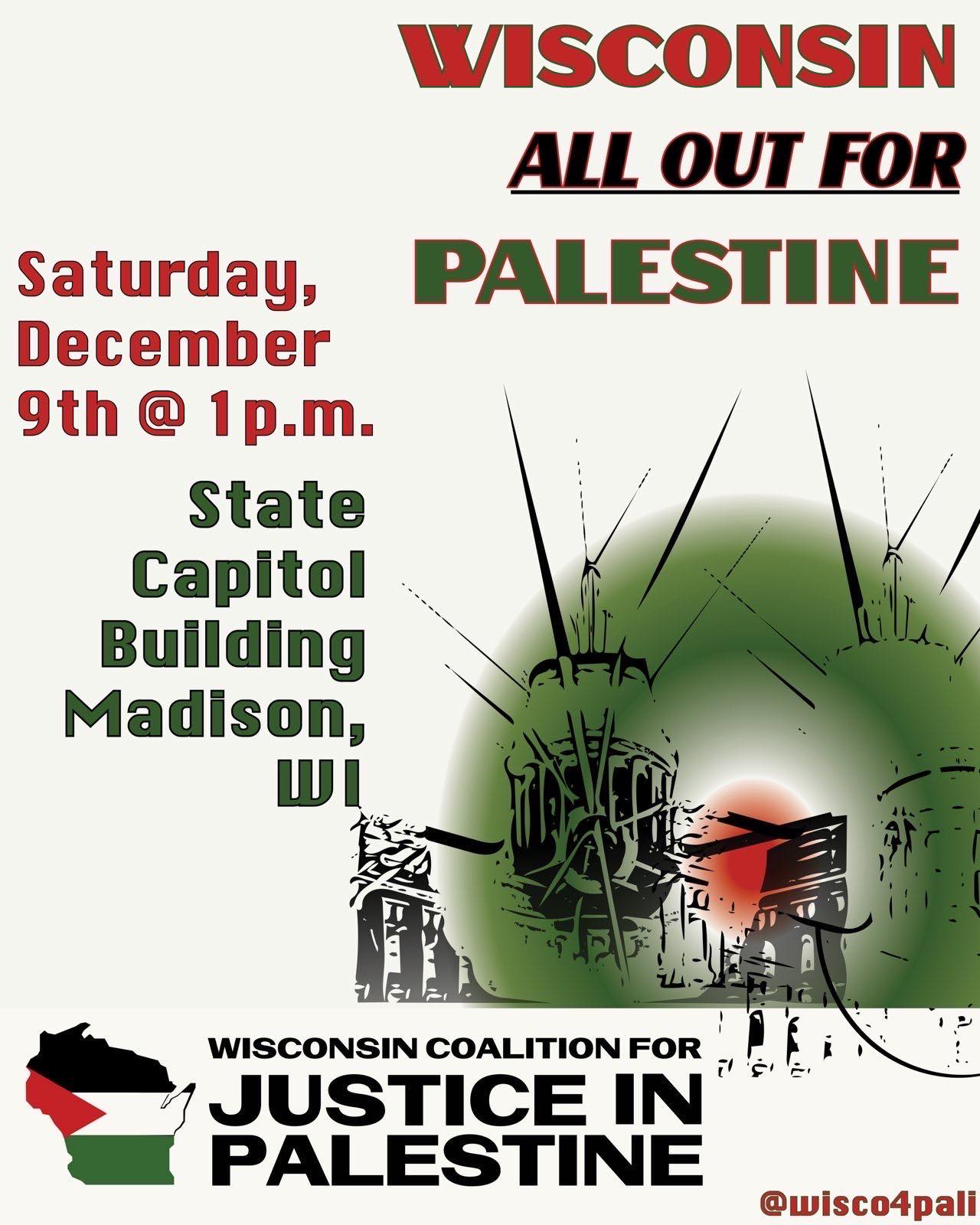 Categories Uncategorized Wisconsin ALL OUT FOR PALESTINE! – Madison, December 9, 2023 Rally & March! Post author By wibailoutpeople Post date November 21, 2023 @wisco4pali Share this: Share on X (Opens in new window) X Share on Facebook (Opens in new window) Facebook Like Loading... Related ← UE Helps Initiate Labor Call for Ceasefire in Israel and Palestine → Wisconsin: Union and Community Organizations Rally at the State Capitol to Demand Fair Maps and an End to Gerrymandering November 21, 2023