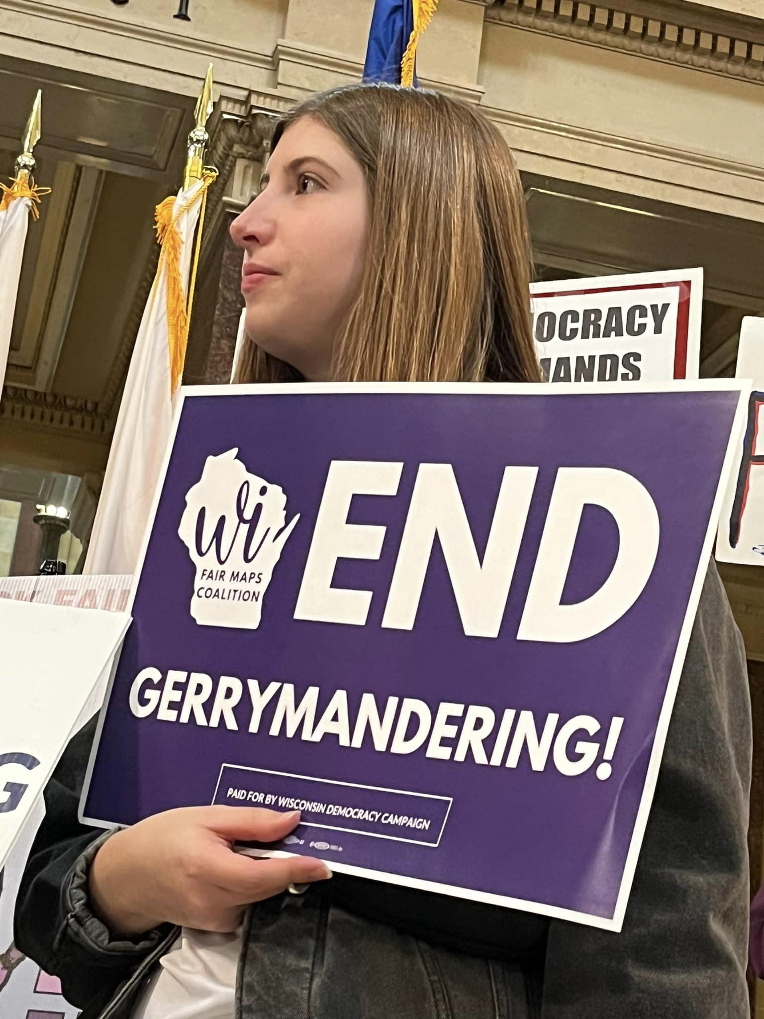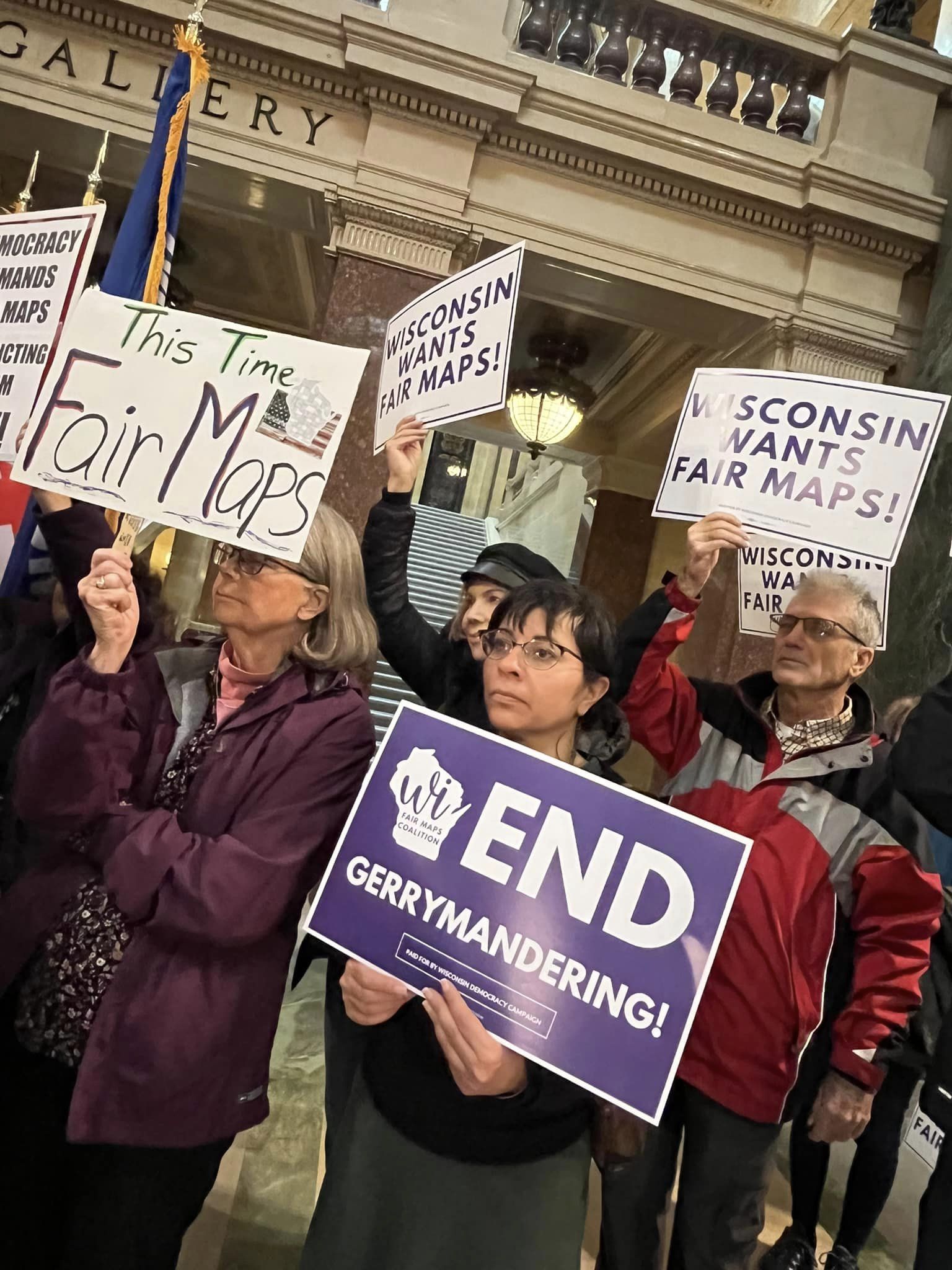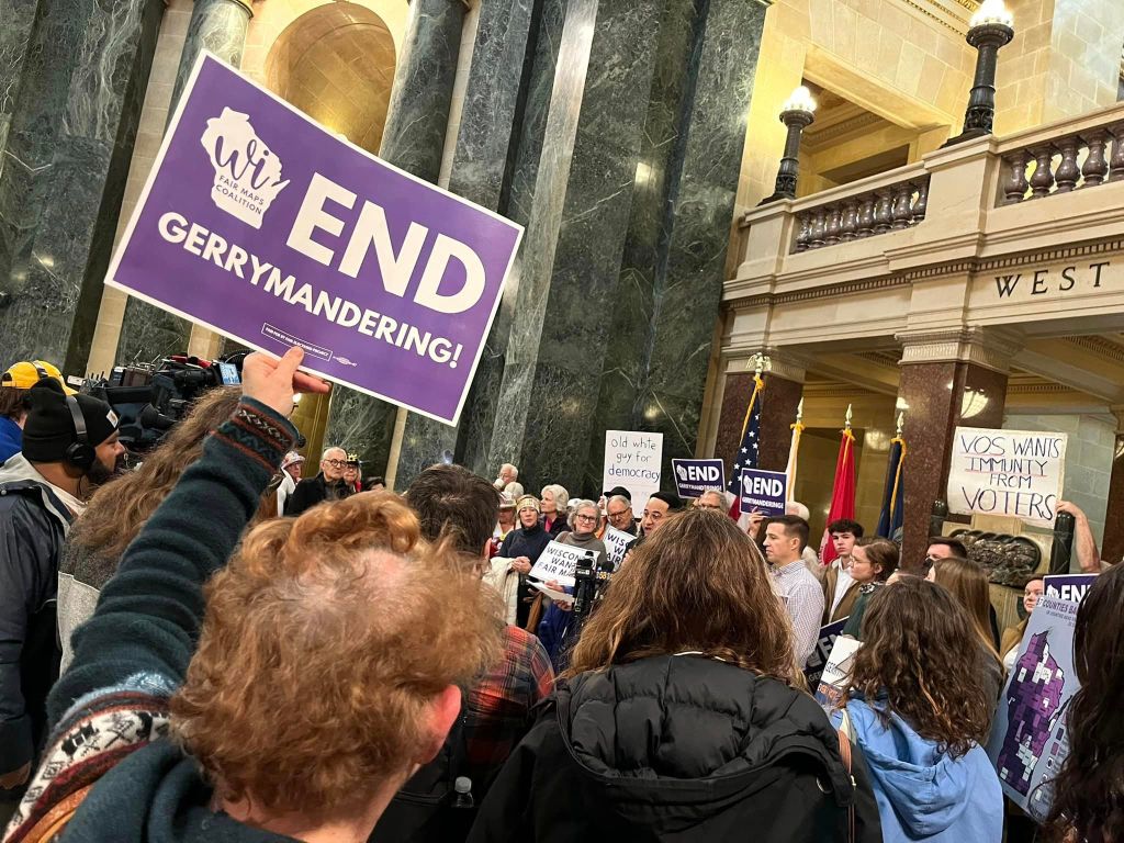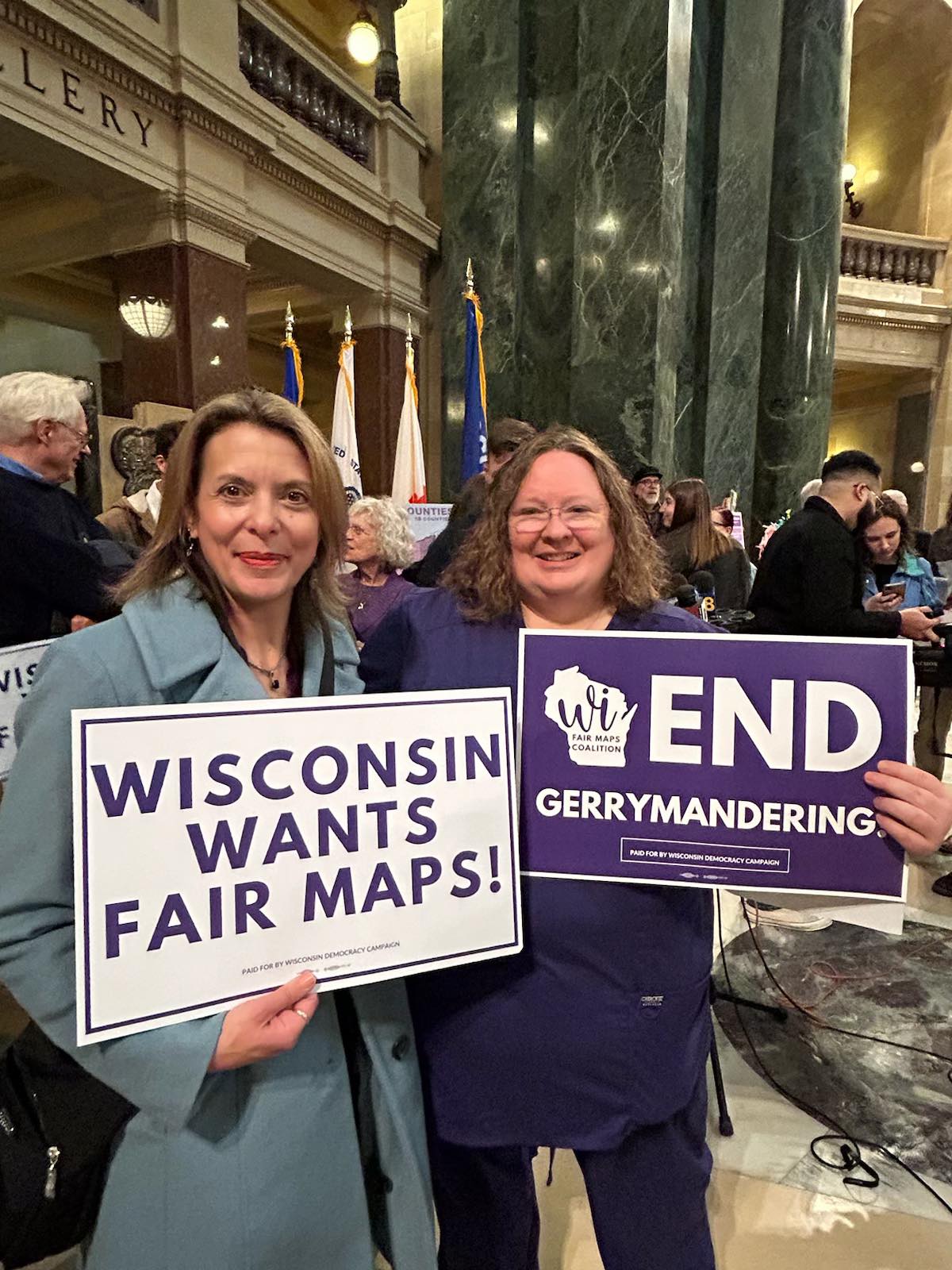 Peggy Wirtz-Olsen, president of WEAC, the state educators union and Pat Raes, president of SEIU Wisconsin (representing tens of thousands workers collectively), unite with other union and community organizations November 21, 2023 at the State Capitol in Madison to demand fair voting maps and an end to gerrymandering. The press conference rallies in Madison, Eau Claire, Green Bay and Milwaukee November 21 were organized by the Working Families Party, Souls to the Polls,the ACLU WI, SEIU Wisconsin and others. / Photos: We Rise Fighting – Labor Podcast