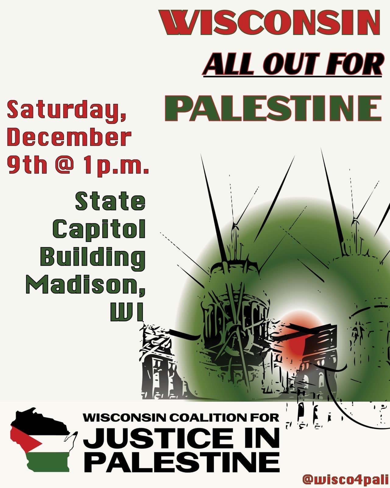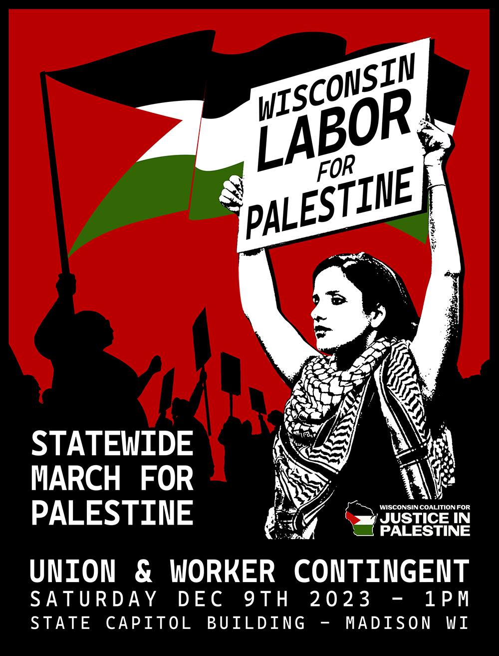 Categories Uncategorized December 9, 2023: Wisconsin Labor for Palestine at Statewide Rally & March in Madison Post author By wibailoutpeople Post date November 24, 2023 Share this: Share on X (Opens in new window) X Share on Facebook (Opens in new window) Facebook Like Loading... Related ← Cuba and Palestine Forever! → The Global Conscience Convoy