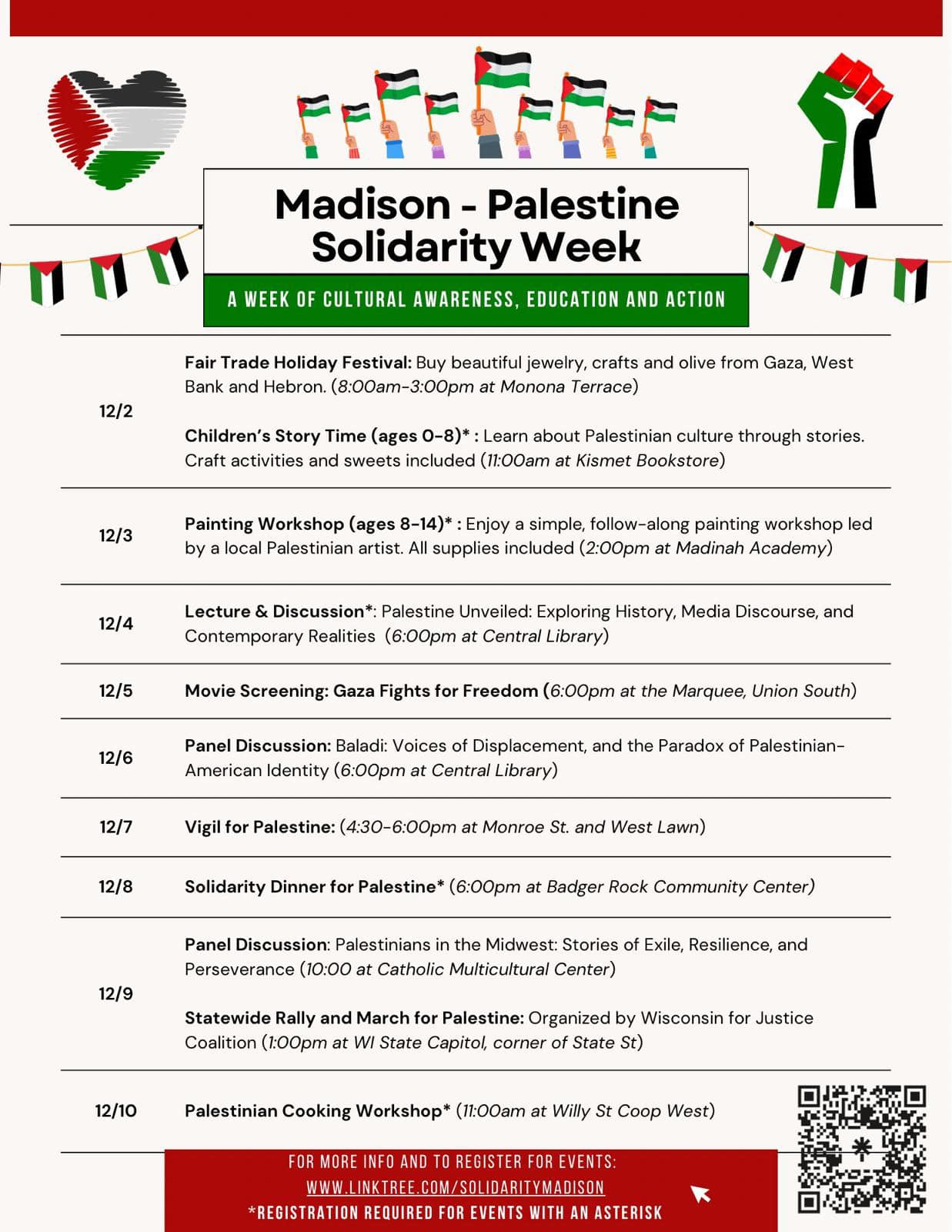 Categories Uncategorized Madison – Palestine Solidarity Week December 2-10, 2023 (Event Listings) Post author By wibailoutpeople Post date November 24, 2023 https://linktr.ee/solidaritymadison Madison-Rafah Sister City Project Share this: Share on X (Opens in new window) X Share on Facebook (Opens in new window) Facebook Like Loading... Related ← Wisconsin Labor for Palestine Contingent Planned for December 9, 2023 at Statewide Rally and March in Madison → Madison, December 7, 2023: Lights Up for Palestine! – Protest Vigil