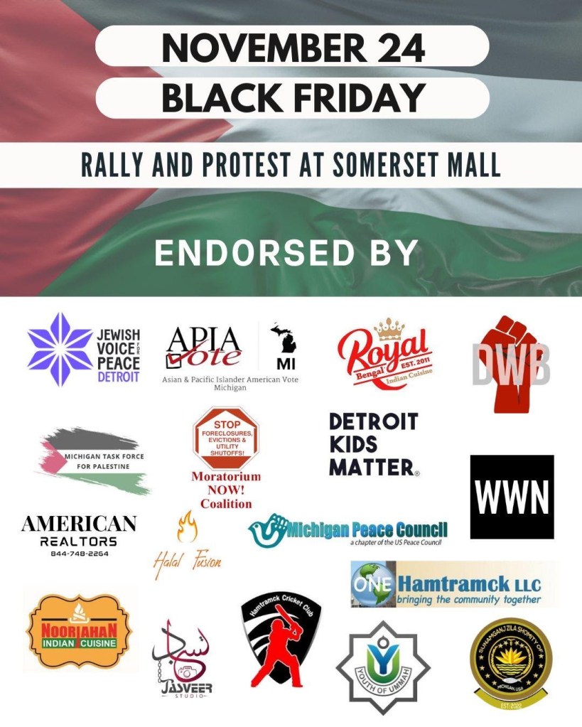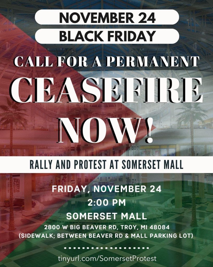 Categories Uncategorized Troy, MI November 24, 2023: Permanent Ceasefire! Rally at Somerset Mall Post author By wibailoutpeople Post date November 24, 2023 Share this: Share on X (Opens in new window) X Share on Facebook (Opens in new window) Facebook Like Loading... Related ← Madison, December 7, 2023: Protest Vigil – Lights Up for Palestine! → International labor solidarity with Palestine