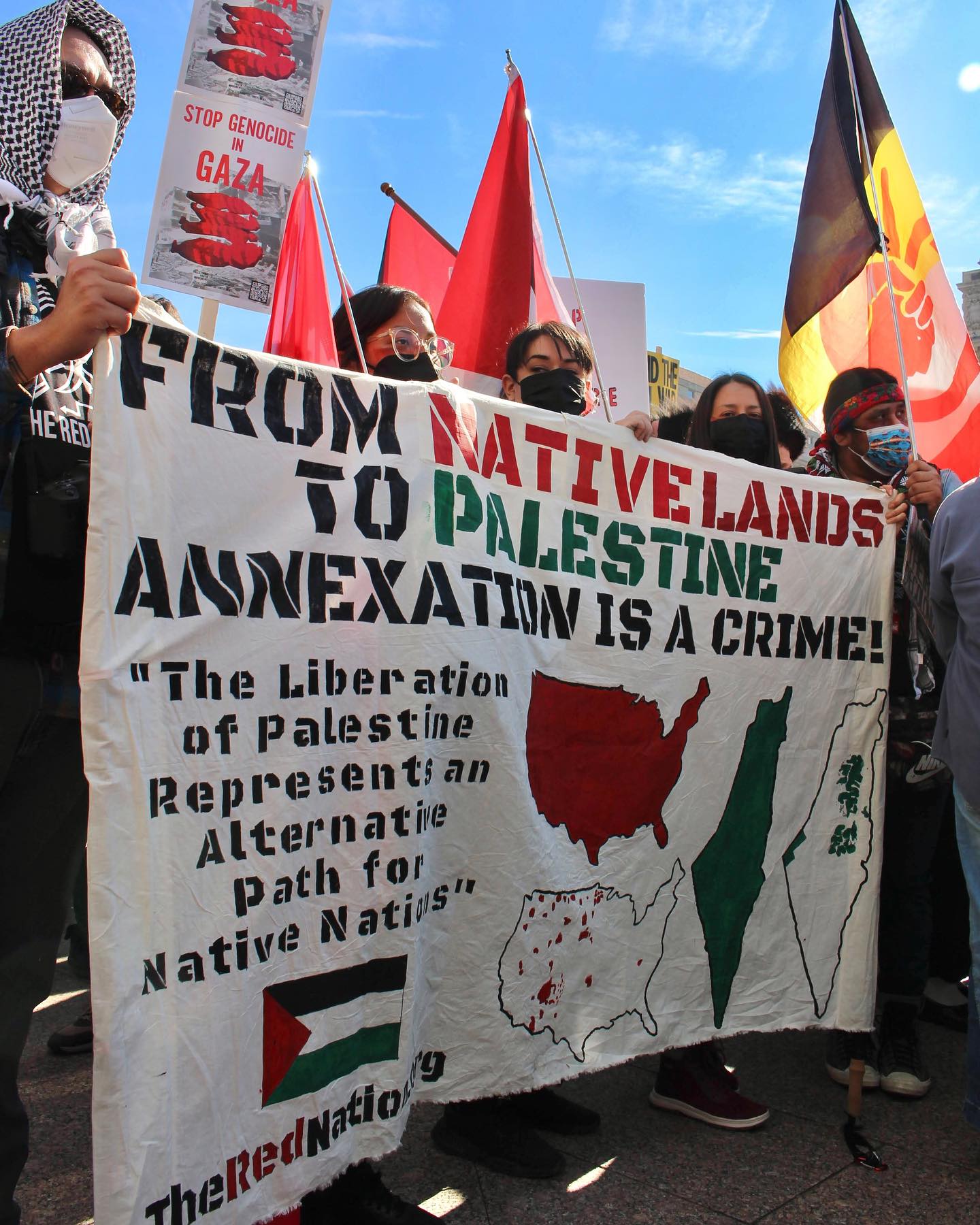 The indigenous people of Turtle Island have a deep connection and respect for their land. As Palestinian people, we not only honor their resilience in the face of ethnic cleansing, but also thank them for their invaluable support and solidarity of our own land back movement. The Native people have marched with us, have vocally spoken out against our oppression and have blocked ship exports holding weapons. The list of their contributions to Palestinian liberation is endless.