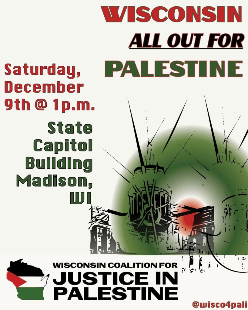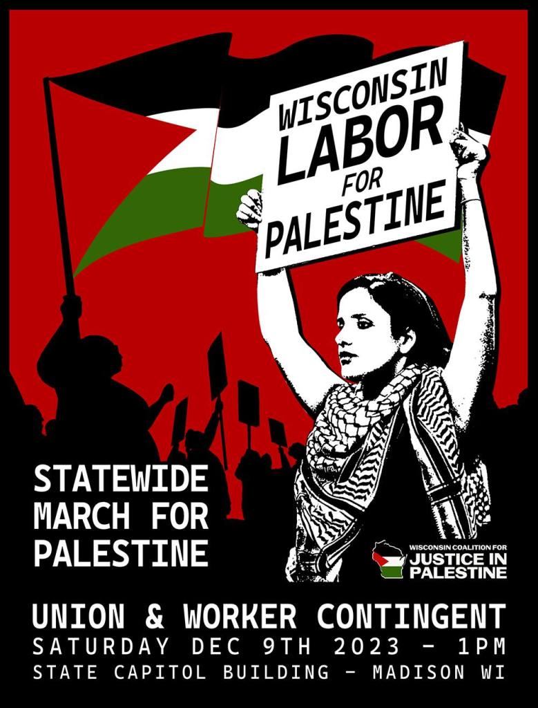 Categories Uncategorized Wisconsin Labor for Palestine Contingent Planned for December 9, 2023 at Statewide Rally and March in Madison Post author By wibailoutpeople Post date November 24, 2023 Share this: Share on X (Opens in new window) X Share on Facebook (Opens in new window) Facebook Like Loading... Related ← South Africa Wants Israel Declared Apartheid State → Madison – Palestine Solidarity Week December 2-10, 2023 (Event Listings)