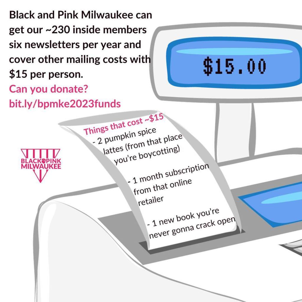 Help us get our #GivingTuesday2023 campaign moving! With each donation to Black and Pink: Milwaukee you foster connection and support for LGBTQ+ incarcerated folks in WI! As an all volunteer organization, $15 for each of our inside members covers our work for an entire year. We send in 6 newsletters per year featuring writing and art from incarcerated folks, news, resources, and connections to LGBTQ+ culture that many of us take for granted. Please give: bit.ly/bpmke2023funds