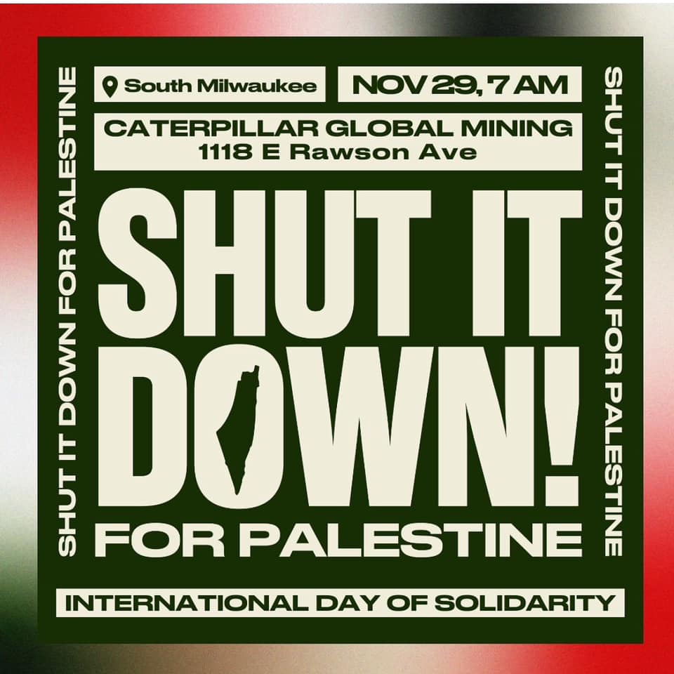 Categories Uncategorized Milwaukee, November 29, 2023: Shut It Down for Palestine! – Protest at Caterpillar Global Mining Post author By wibailoutpeople Post date November 28, 2023 Share this: Share on X (Opens in new window) X Share on Facebook (Opens in new window) Facebook Like Loading... Related ← On Strike, Shut It Down! “The Wisconsin TA Strike,” a Documentary on the 1970 TAA Union → Oregon Federation of Nurses & Health Professionals:
