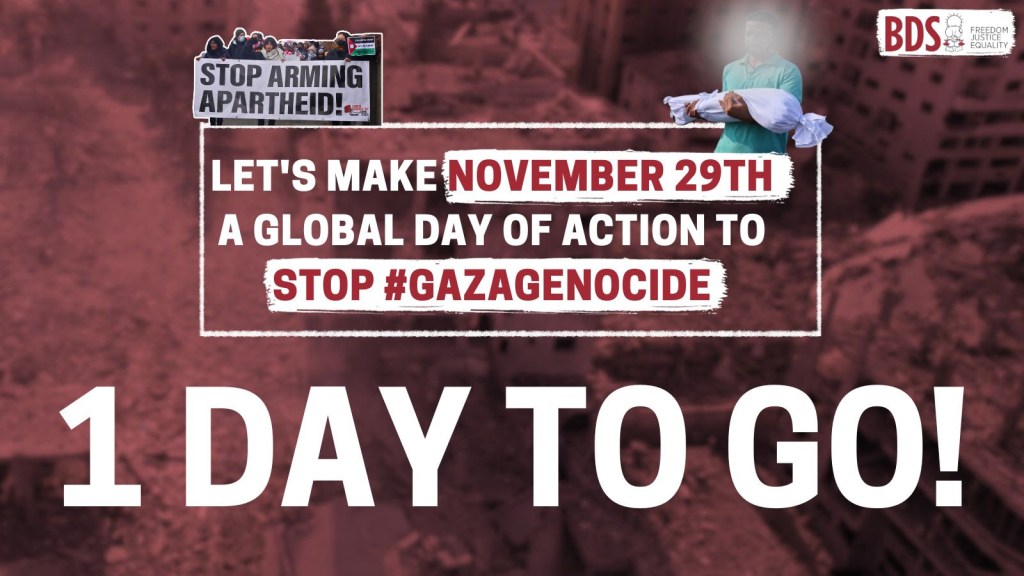 | Dear supporter, Tomorrow, November 29th, the International Day of Solidarity with the Palestinian People, the #BDS movement is calling for an all day social media storm. Our physical and digital actions can be used together to strengthen our demands: Permanent ceasefire and lifting the siege to stop Israel’s genocide in Gaza. Lawful sanctions on Israel, including a #MilitaryEmbargo. Pressure on the International Criminal Court (ICC) to issue arrest warrants for Israeli leaders. |