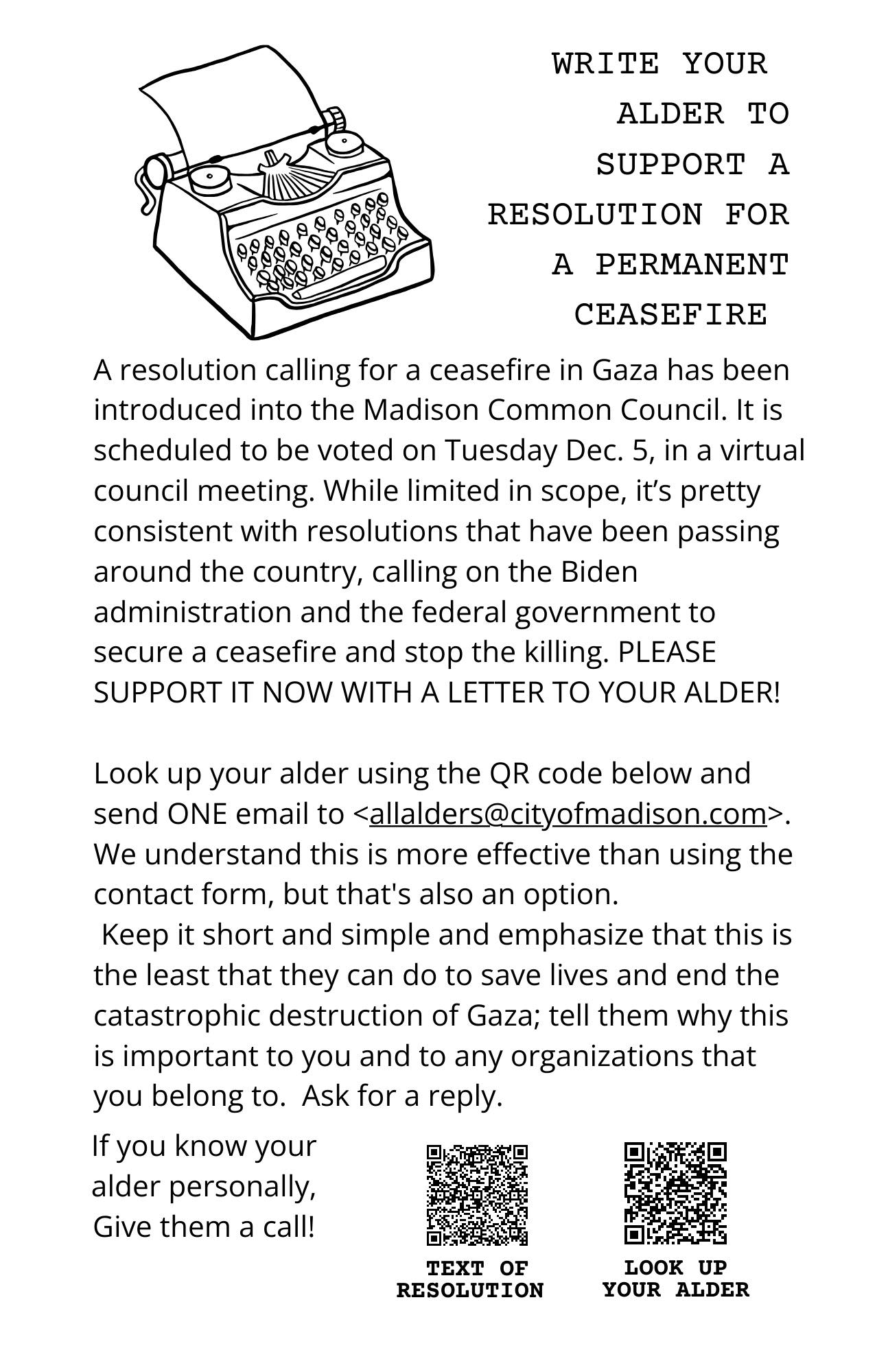 A resolution calling for a ceasefire in Gaza has been introduced into the Madison Common Council. It is scheduled to be voted on next Tuesday Dec. 5, in a virtual council meeting. While limited in scope, its pretty consistent with resolutions that have been passing around the country, calling on the Biden administration and the federal government to secure a ceasefire and stop the killing.