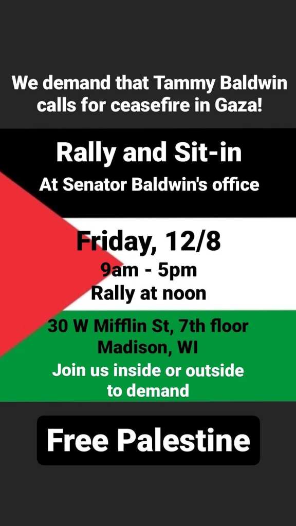 Categories Uncategorized Madison, December 8, 2023: Demand that Tammy Baldwin Call for Permanent U.S.-Israeli Ceasefire! Post author By wibailoutpeople Post date December 7, 2023 Share this: Click to share on X (Opens in new window) X Click to share on Facebook (Opens in new window) Facebook Like Loading... Related ← Lights Up for Palestine in Madison December 7, 2023 (Photos) → December 9, 2023 Stand for Peace Free Palestine! Actions in Wisconsin (Madison, Milwaukee, Racine, Viroqua)