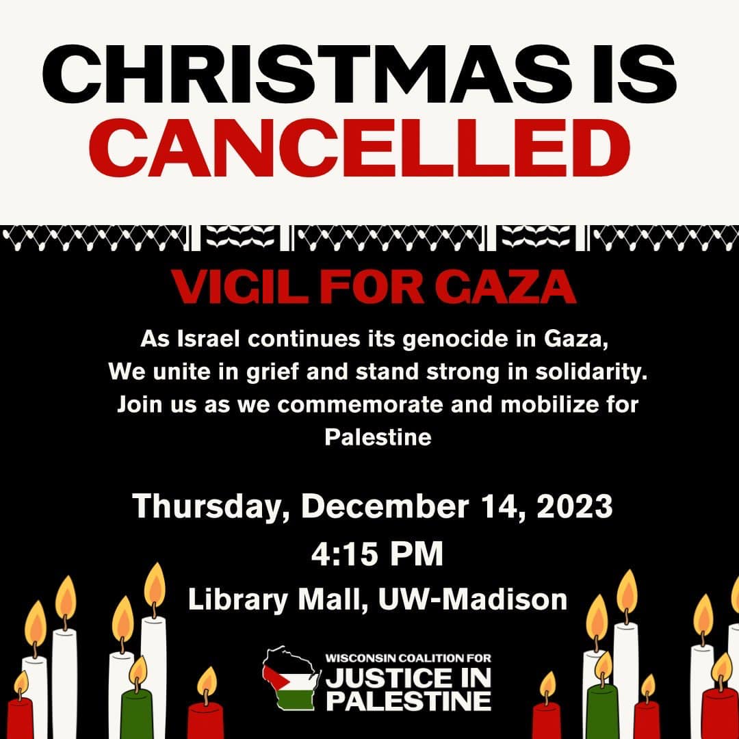 Categories Uncategorized “Christmas Is Cancelled” Vigil for Palestine at UW Madison December 14, 2023 Post author By wibailoutpeople Post date December 12, 2023 Wisconsin Coalition for Justice in Palestine Share this: Share on X (Opens in new window) X Share on Facebook (Opens in new window) Facebook Like Loading... Related ← Madison, December 19, 2023: Candlelight Vigil at Tammy Baldwin’s Office – Permanent Ceasefire Now! – Stop U.S. “Aid” to Israel → Webinar, December 12, 2023: Tampa 5 Charges Dropped, Lessons from the Struggle