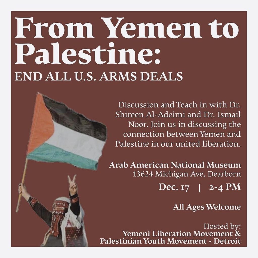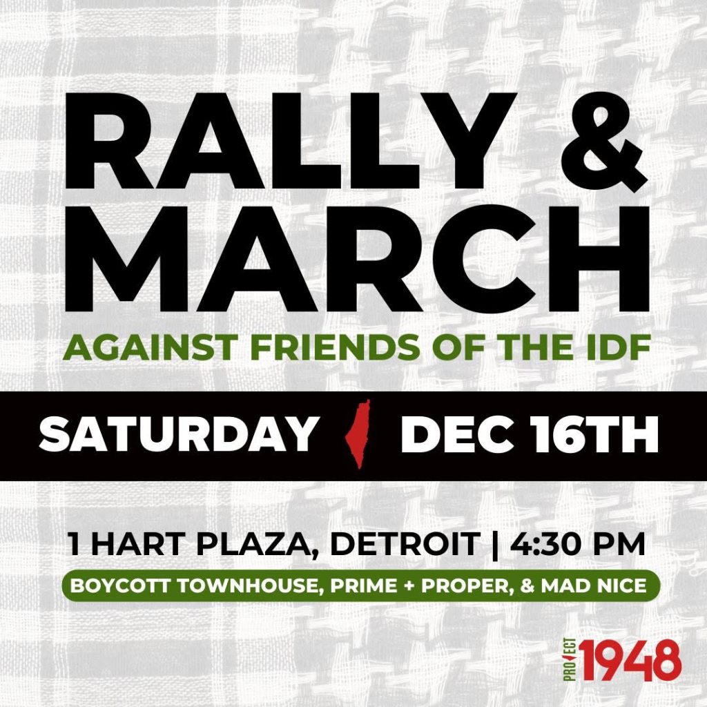 Categories Uncategorized Detroit: Free Palestine Events December 16 & 17, 2023 Post author By wibailoutpeople Post date December 15, 2023 Share this: Click to share on X (Opens in new window) X Click to share on Facebook (Opens in new window) Facebook Like Loading... Related ← Milwaukee Bill Board for Palestine! → THOUGHTS ABOUT GAZA ALONG PORTO SANTO BEACH | GAZA ON MY MIND | AI – for Apartheid Intelligence | BLUE SKY BLUES