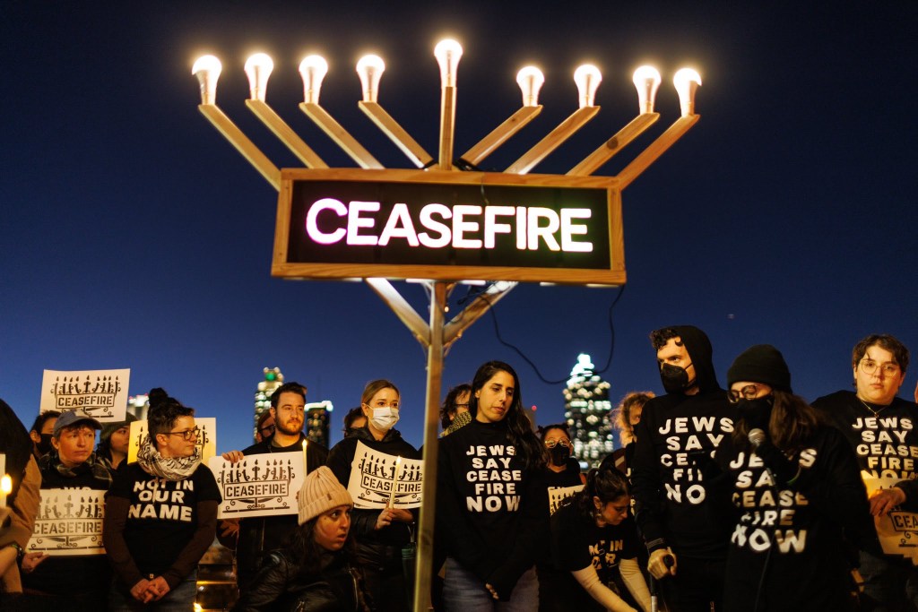 | Last Thursday, on the eighth night of Hanukkah, JVP members shut down eight bridges and highways in eight cities across the U.S. to demand an end to the genocide of Palestinians. Thousands of Jews and allies protested in Philadelphia, Washington, D.C., Atlanta, Chicago, Minneapolis, Seattle, Portland, Los Angeles, and San Diego — eight cities symbolizing the eight candles lit on the final night of Hanukkah, plus the shamash, or “helper” candle. JVP members blocked traffic for hours, singing, chanting, carrying giant menorahs, and holding signs reading “Jews says ceasefire now” and “Let Gaza live.” Hundreds were arrested. Our message is clear: As long as Israel is dropping bombs on Gaza, there can be no business as usual. In just over two months, over 19,000 Palestinians have been killed by the Israeli military in Gaza. Over 7,000 of them were children. Two weeks ago, the World Health Organization warned that even more people in Gaza could die of starvation or disease than have already been killed by Israel’s bombs. Today, half of the over two million people who live in Gaza are starving, and the vast majority of them have been forced to flee their homes. But nowhere in Gaza is safe… |