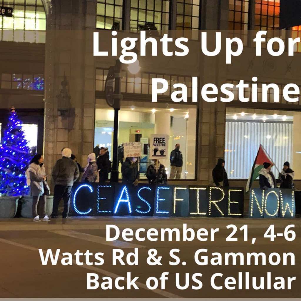 Categories Uncategorized Madison, December 21, 2023: Lights Up for Palestine! Post author By wibailoutpeople Post date December 18, 2023 Madison-Rafah Sister City Project Share this: Share on X (Opens in new window) X Share on Facebook (Opens in new window) Facebook Like Loading... Related ← The Palestine Chronicle → Fidel Castro speech in 1966: ‘We Revolutionary Cubans Understand Our International Obligations’