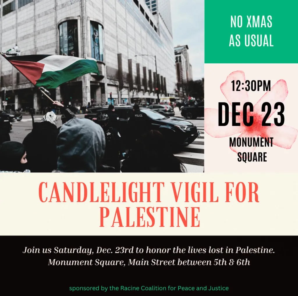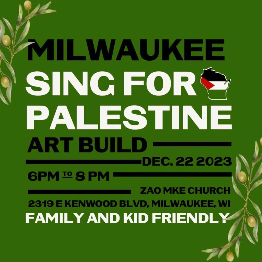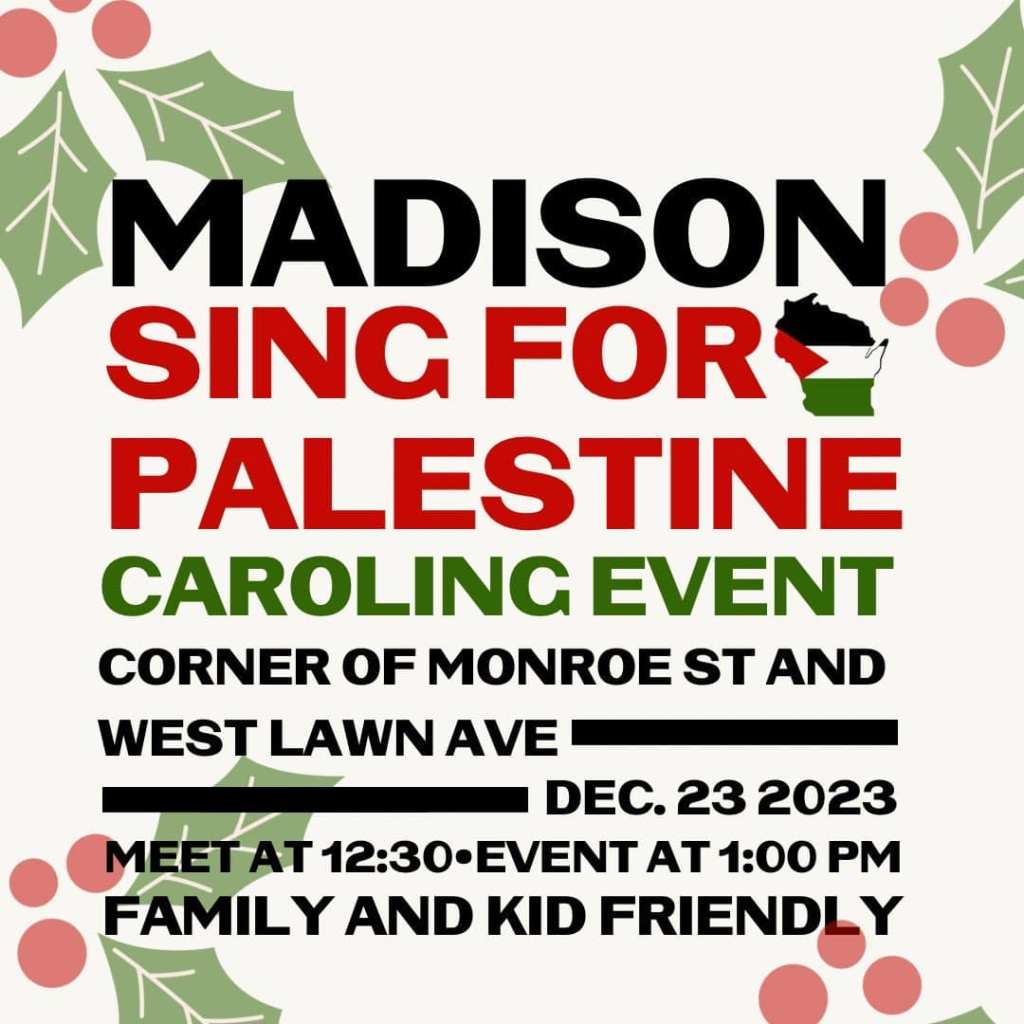 Categories Uncategorized Singing for Palestine in Madison, Milwaukee and Racine December 23, 2023 Post author By wibailoutpeople Post date December 21, 2023 Wisconsin Coalition for Justice in Palestine Wisconsin Coalition for Justice in Palestine Racine Coalition for Peace and Justice Share this: Click to share on X (Opens in new window) X Click to share on Facebook (Opens in new window) Facebook Like Loading... Related ← Milwaukee Sings for Palestine Caroling Event December 23, 2023 → Wisconsin Supreme Court Orders New Legislative Maps for 2024 Elections