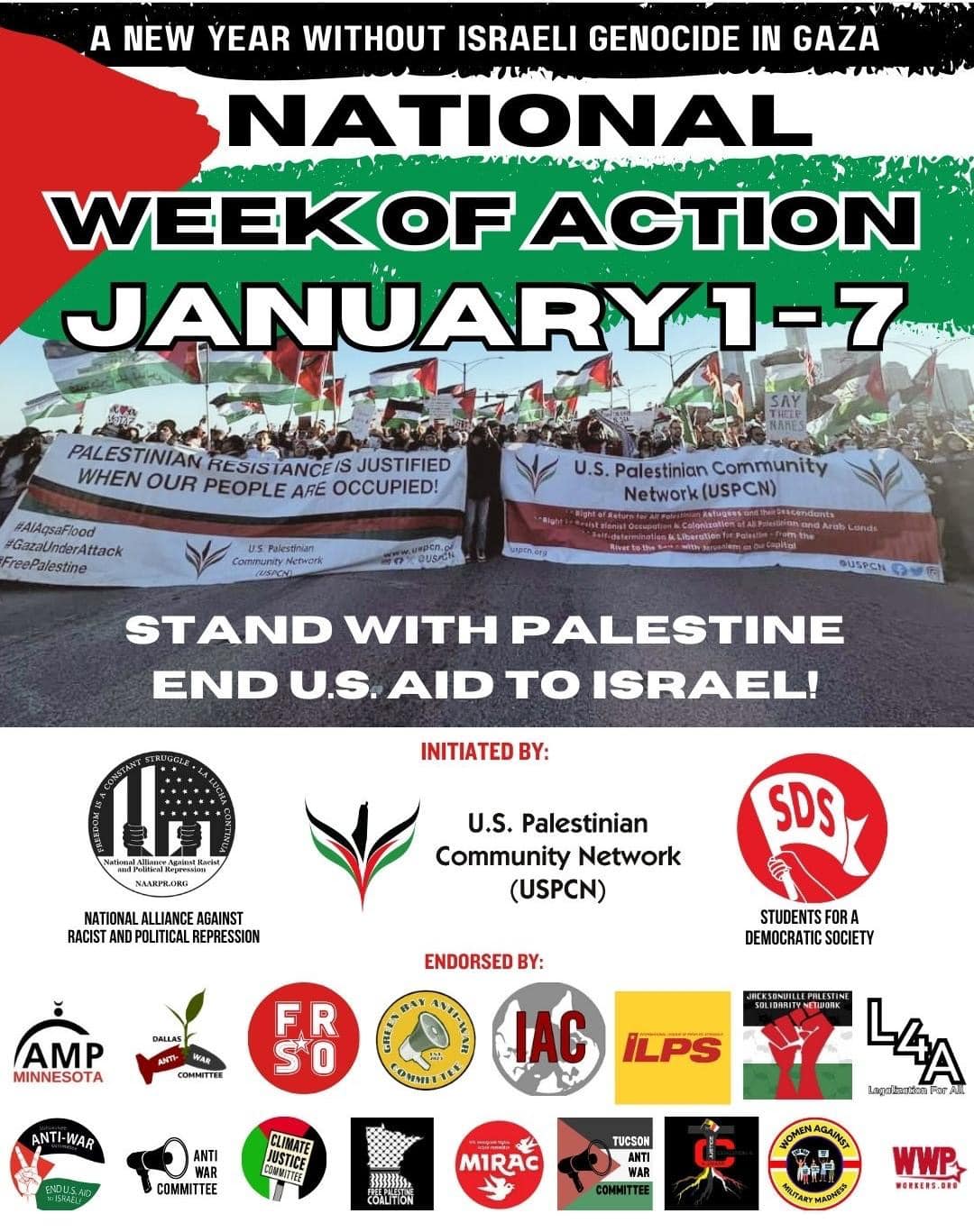 Categories Uncategorized January 1-7, 2024: National Week of Action, Stand With Palestine! – End U.S. ‘Aid’ to Apartheid Israel! – Stop the Genocide! Post author By wibailoutpeople Post date December 26, 2023 US Palestinian Community Network – شبكة الجالية الفلسطينية Share this: Click to share on X (Opens in new window) X Click to share on Facebook (Opens in new window) Facebook Like Loading... Related ← People’s Mural for Palestine, Milwaukee and Worldwide! → Tasks of the Progressive Movement for 2024