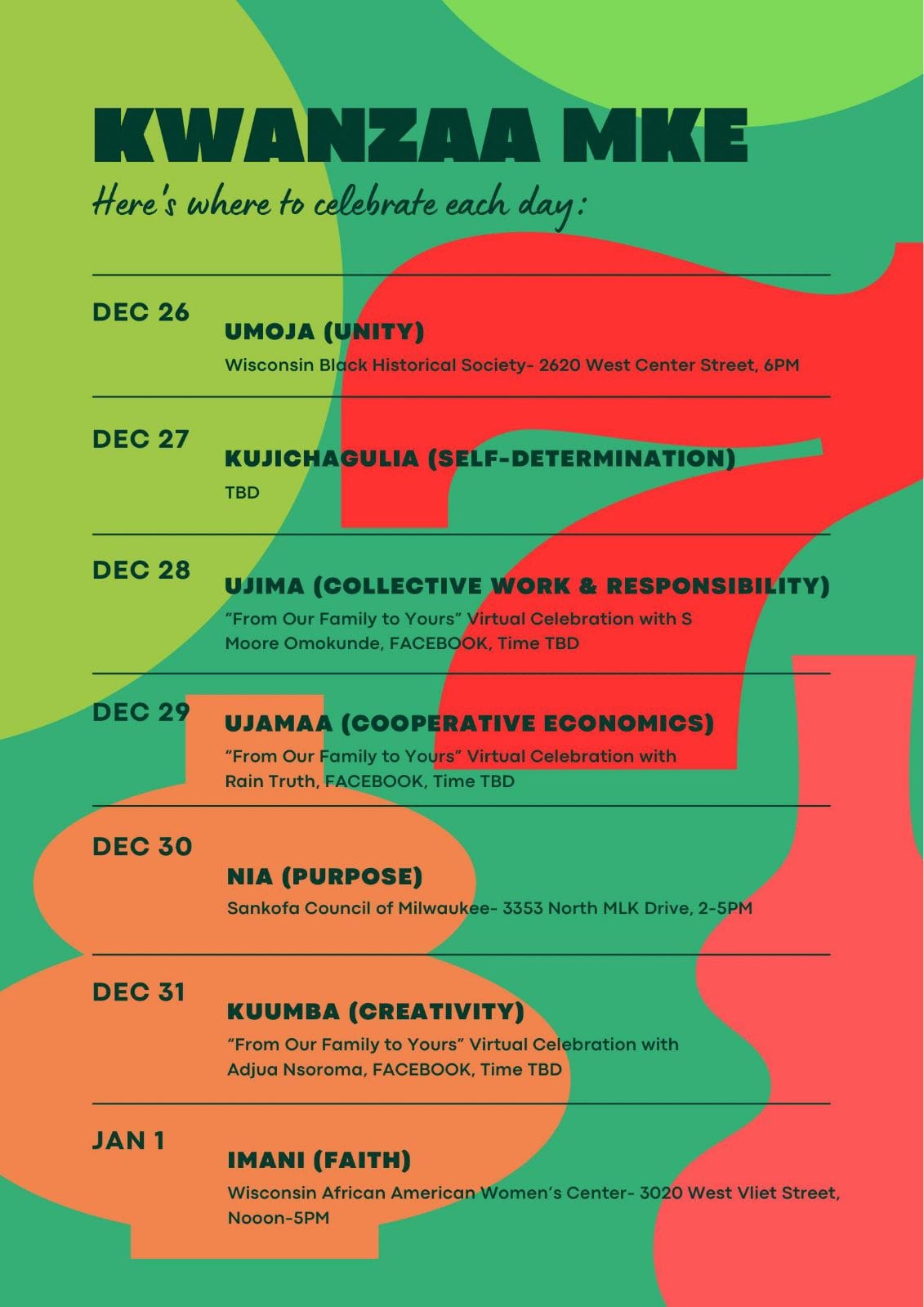 Categories Uncategorized Kwanzaa Milwaukee December 26, 2023 – January 1, 2024 Post author By wibailoutpeople Post date December 26, 2023 Share this: Click to share on X (Opens in new window) X Click to share on Facebook (Opens in new window) Facebook Like Loading... Related ← “Long Live Palestine, Crush Zionism” – Swedish Pro-Palestine Song → People’s Mural for Palestine, Milwaukee and Worldwide!