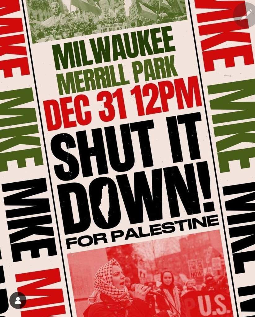 Categories Uncategorized Milwaukee, December 31, 2023: Shut It Down for Palestine! Post author By wibailoutpeople Post date December 28, 2023 Milwaukee4Palestine Share this: Click to share on X (Opens in new window) X Click to share on Facebook (Opens in new window) Facebook Like Loading... Related ← Newark, NJ: MLK March & Rally January 15, 2024 → Kenosha, January 14, 2024: Rebuild Gaza Together: A Community Fundraiser