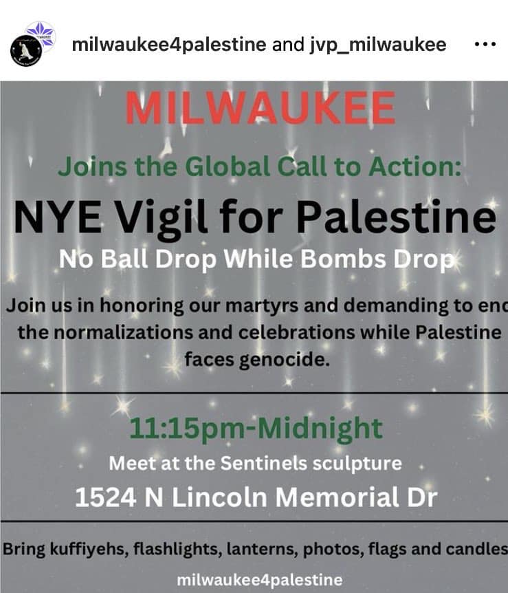 Categories Uncategorized Milwaukee, December 31, 2023: Vigil for Palestine! – No Ball Drop While Bombs Drop! Post author By wibailoutpeople Post date December 31, 2023 Milwaukee4Palestine Jewish Voice for Peace – Milwaukee Share this: Click to share on X (Opens in new window) X Click to share on Facebook (Opens in new window) Facebook Like Loading... Related ← Madison, January 4, 2024: Lights Up for Palestine! → On Gaza, Yemen, the Arabs, the Media and What’s Next – Q&A with Ramzy Baroud