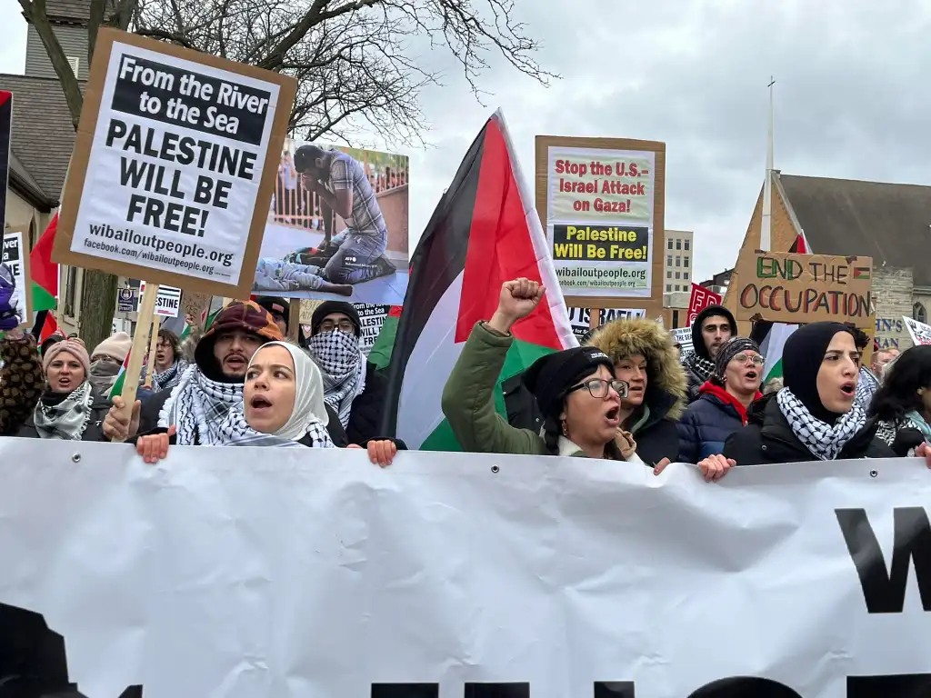 Categories Uncategorized Madison, January 12, 2024: Protest for Gaza at Senator Tammy Baldwin’s Office Post author By wibailoutpeople Post date January 11, 2024 30 W Mifflin St, 7th floor, Madison, WI Lunchtime Vigil with Music – Friday, Jan 12, 2024 Peace Action of WIhttps://www.peaceactionwi.org/ Wisconsin Coalition for Justice in Palestine march in Madison, Wisconsin December 9, 2023. / Photo: Wisconsin Bail Out The People Movement Share this: Share on X (Opens in new window) X Share on Facebook (Opens in new window) Facebook Like Loading... Related ← Wisconsin Coalition for Justice in Palestine: Emergency Milwaukee Press Conference & Rally, January 12, 2024 → Yemen Resistance Vows to Respond to United States and British Airstrikes