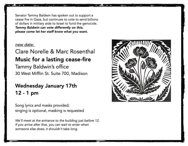 Categories Uncategorized Madison, January 17, 2024: Music for a Lasting Cease Fire Post author By wibailoutpeople Post date January 15, 2024 Madison-Rafah Sister City Project Share this: Click to share on X (Opens in new window) X Click to share on Facebook (Opens in new window) Facebook Like Loading... Related ← Rev. Dr. Martin Luther King, Jr. on Labor, Wealth and Justice → Madison, January 16, 2024: Lights Up for Palestine!