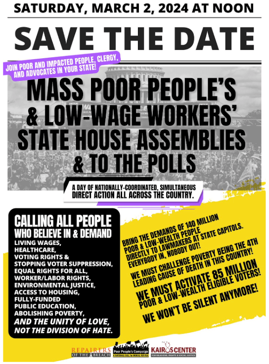March 2 will be a simultaneous day of direct action at statehouses all across the country. We aim to bring together thousands of poor and low-wealth people and their allies to demand a moral agenda from our lawmakers at the state level.