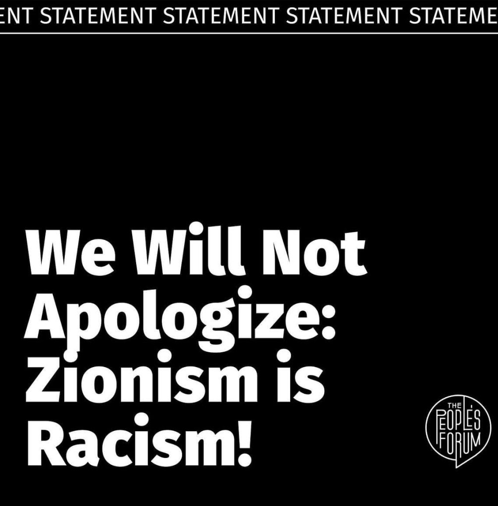 Anti-Zionism is not anti-Semitism. Everyone who has ever been at The People’s Forum knows that we welcome people of all faiths and backgrounds who are committed to the struggle for justice. For 100 days, we have proudly marched and organized with hundreds of thousands of people in New York and across the country, many of them Jewish people who stand in the proud tradition of anti-fascism and anti-Zionism, who have rightly declared that the State of Israel, by falsely associating its crimes with the Jewish faith, make Jewish people less safe, not more safe.