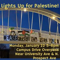 Categories Uncategorized Madison, January 22, 2024: Lights Up for Palestine! Post author By wibailoutpeople Post date January 19, 2024 Madison-Rafah Sister City Project Share this: Click to share on X (Opens in new window) X Click to share on Facebook (Opens in new window) Facebook Like Loading... Related ← Federal appellate court blocks new state law aimed at banning books → Madison, Feb. 10, 2024: Stop the Hate: Build People’s Unity!