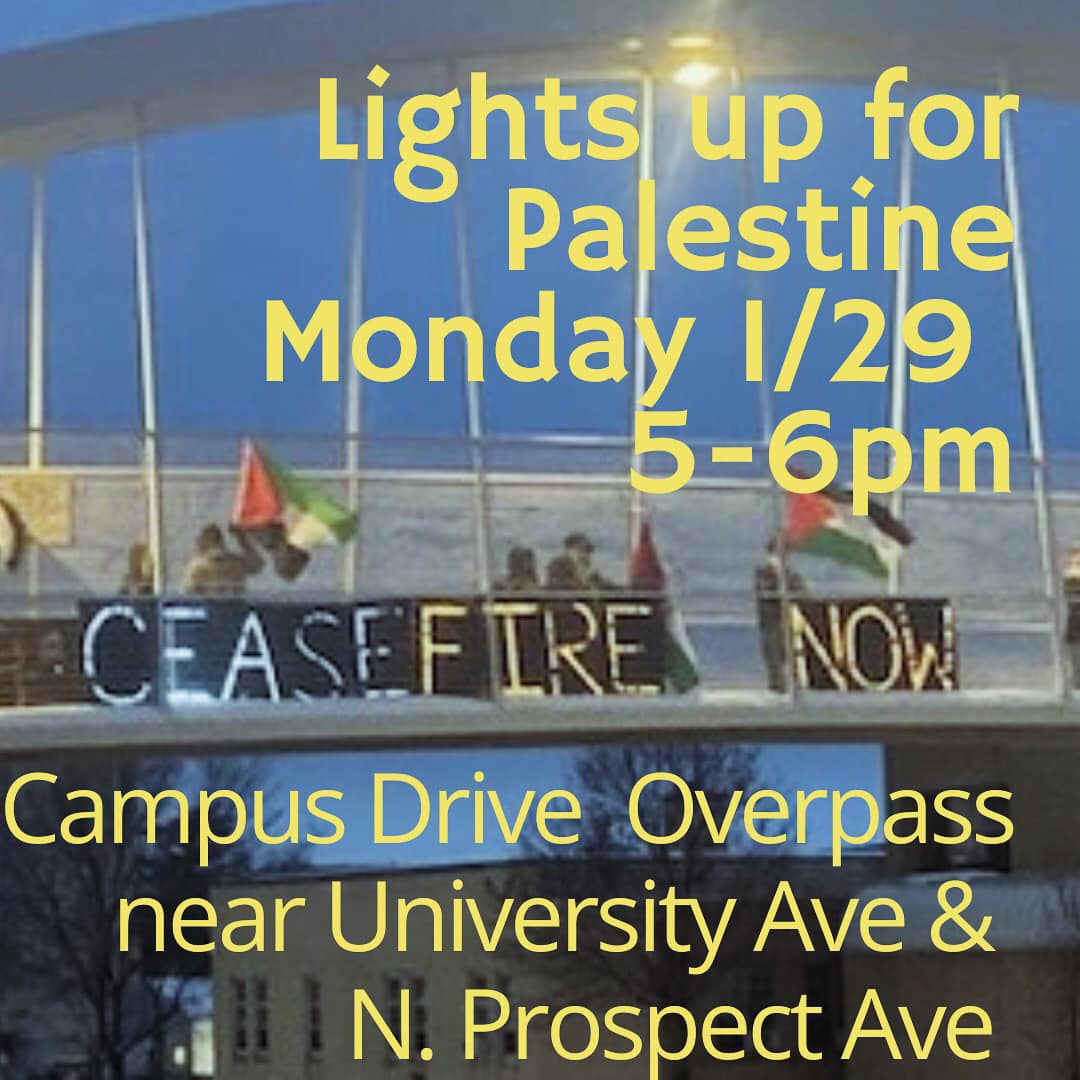 Categories Uncategorized Madison, January 29, 2024: Lights Up for Palestine! Post author By wibailoutpeople Post date January 26, 2024 Madison-Rafah Sister City Project Share this: Click to share on X (Opens in new window) X Click to share on Facebook (Opens in new window) Facebook Like Loading... Related ← Cuba: The Latin American School of Medicine Awarded with International Accreditation → Remembering Activist and Founding December 12th Movement Leader Viola Plummer