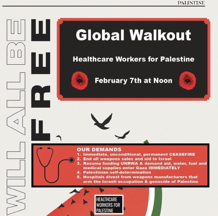 Categories Uncategorized Healthcare Workers for Palestine Global Walkout Feb 7, 2024 at NOON Post author By wibailoutpeople Post date February 6, 2024 Share this: Share on X (Opens in new window) X Share on Facebook (Opens in new window) Facebook Like Loading... Related ← Emergency Civil Rights Lawsuit filed on behalf of Kevin “Rashid” Johnson → Madison, Feb. 9, 2024: Lights Up for Palestine!