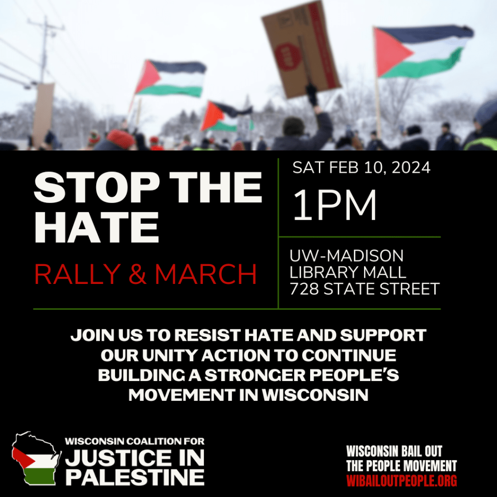 MADISON, WI — Wisconsin labor and community organizations host “Stop the Hate: Build People’s Unity” rally Saturday, Feb. 10, 2024 at 1 P.M. at Library Mall at UW Madison, followed by a march down State Street for a speak out at Capitol Square.