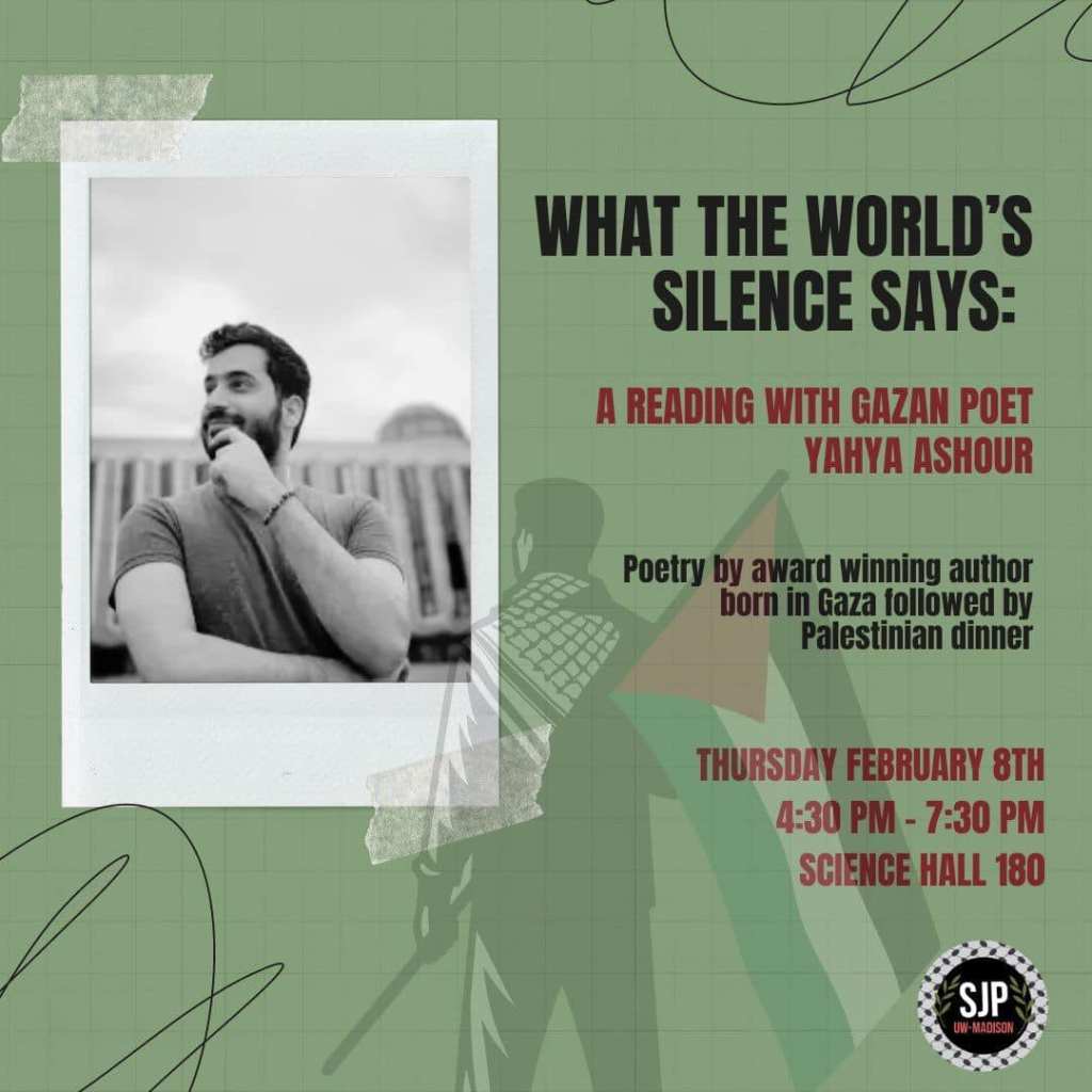 Categories Uncategorized UW Madison, Feb. 8, 2024: A Reading with Gazan Poet Yahya Ashour Post author By wibailoutpeople Post date February 6, 2024 Share this: Share on X (Opens in new window) X Share on Facebook (Opens in new window) Facebook Like Loading... Related ← Madison, Feb. 9, 2024: Lights Up for Palestine! → Countries which aid Israel complicit in genocide – South Africa warns