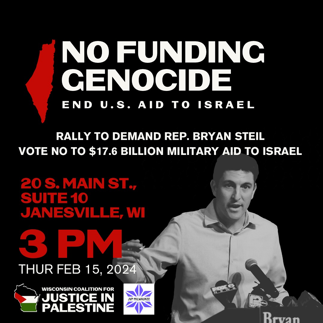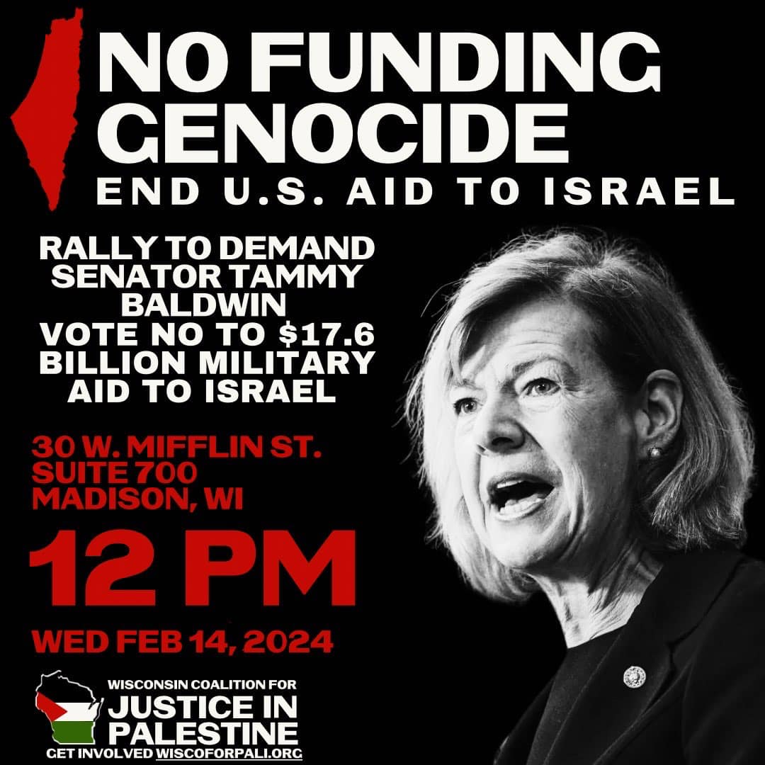 12 noon – 30 W Mifflin St, 7th floor – Vigil inside Baldwin’s office and make antiwar valentines for Senators Baldwin and Johnson, and Rep Pocan.