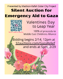 Silent online auction starts Valentine’s Day at noon and ends February 29 at 5:00 p.m. 100% of proceeds will go immediately to Middle East Children’s Alliance to provide emergency food, water, shelter and medical care in Gaza. The auction is free and open to the public. It can be viewed now, and bidding will start Valentine’s Day at noon at http://32auctions.com/GazaRelief.