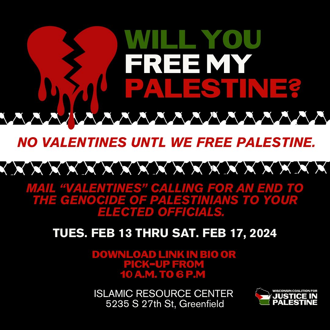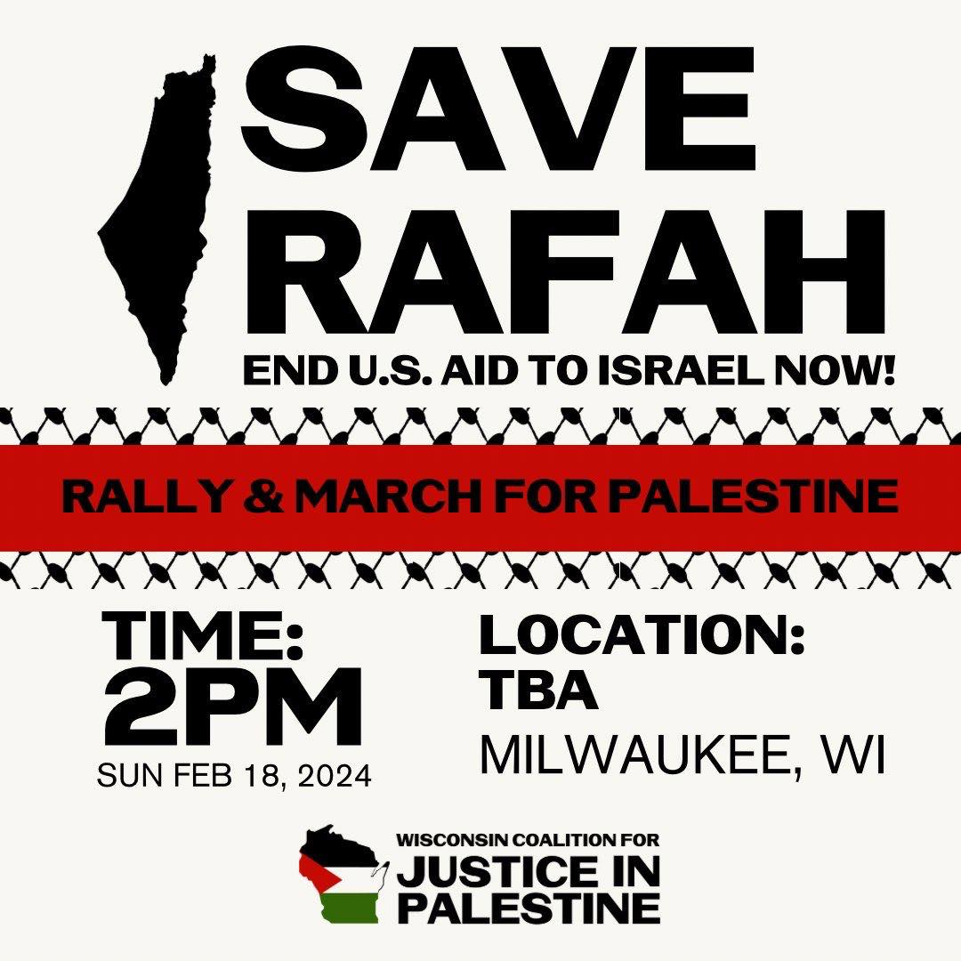 Categories Uncategorized Wisconsin: Week of Action for Palestine Feb. 13-18, 2024! – Rally & March in Milwaukee Feb. 18! Post author By wibailoutpeople Post date February 12, 2024 Wisconsin Coalition for Justice in Palestine / wiscoforpali Wisconsin Coalition for Justice in Palestine / wiscoforpali Wisconsin Coalition for Justice in Palestine / wiscoforpali Wisconsin Coalition for Justice in Palestine / wiscoforpali wiscoforpali wiscoforpali@gmail.com Wisconsin Coalition for Justice in Palestine Wisconsin Coalition for Justice in Palestine wiscoforpali Share this: Click to share on X (Opens in new window) X Click to share on Facebook (Opens in new window) Facebook Like Loading... Related ← JOIN OUR MARCH TO DEMAND AN END TO POVERTY – Madison, March 2, 2024 – Poor People’s Campaign Rally → Milwaukee, Feb. 18, 2024: SAVE RAFAH! – END U.S. AID TO ISRAEL NOW!