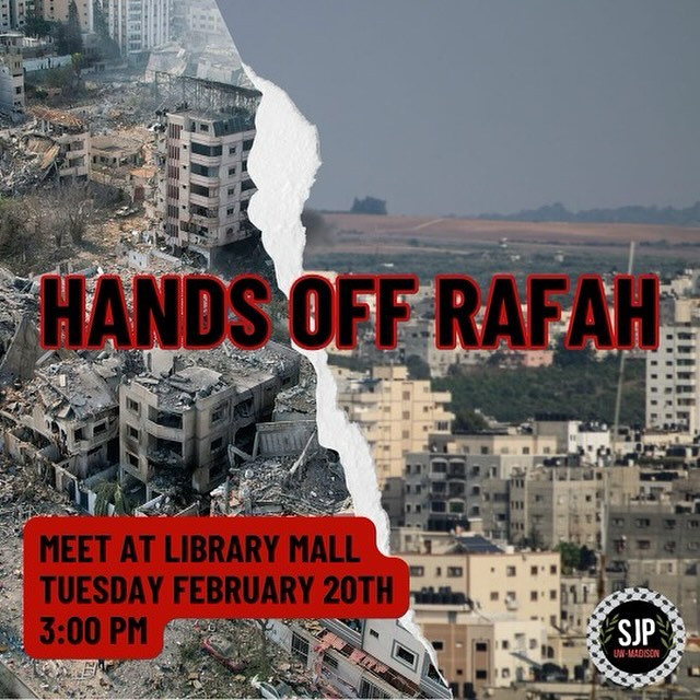 Categories Uncategorized UW Madison, Feb. 20, 2024: Hands Off Rafah! Free Palestine Post author By wibailoutpeople Post date February 18, 2024 @sjpuwmadison Share this: Click to share on X (Opens in new window) X Click to share on Facebook (Opens in new window) Facebook Like Loading... Related ← Read Palestine! Story Time and Activities About Palestine for Kids! – Feb. 24, March 3 and March 24 in the Madison Area → Madison, Feb. 26, 2024: Lights Up for Palestine!