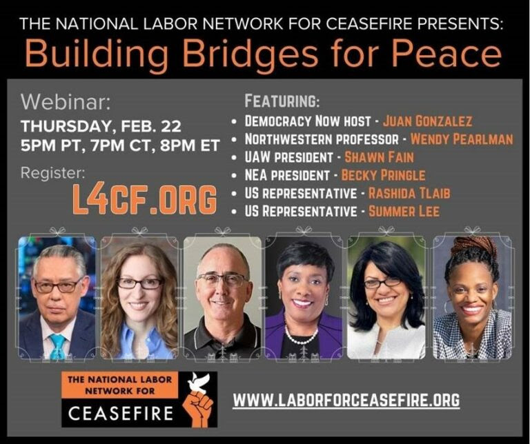 Categories Uncategorized Feb. 22, 2024: The National Labor Network for Ceasefire Presents, Building Bridges for Peace Post author By wibailoutpeople Post date February 22, 2024 Register Here Share this: Click to share on X (Opens in new window) X Click to share on Facebook (Opens in new window) Facebook Like Loading... Related ← Milwaukee, Feb. 25, 2024: OUR STRUGGLES ARE INTERTWINED – Black & Palestinian Liberation! → Venezuela denounces U.S.-based smear campaign against migrants