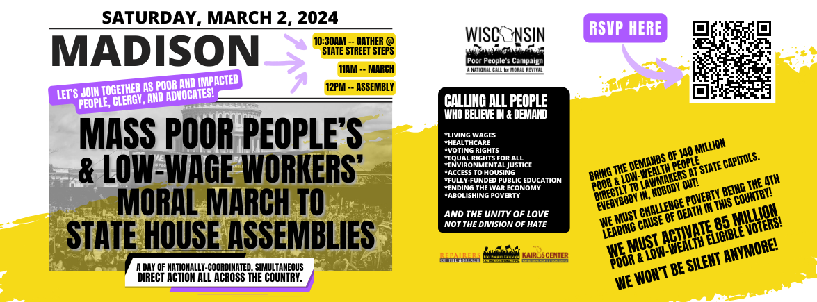 Categories Uncategorized Madison, March 2, 2024: Poor People’s & Low Wage Workers Rally & March Post author By wibailoutpeople Post date February 26, 2024 The Wisconsin Poor People’s Campaign: A National Call For Moral Revival Event Link: https://fb.me/e/4fkTOrMXa Share this: Click to share on X (Opens in new window) X Click to share on Facebook (Opens in new window) Facebook Like Loading... Related ← March 2, 2024: International Day of Solidarity with Palestine! (Event Listings) → The U.S. and Israel Are Purposely Starving Palestinians in Ongoing Genocide