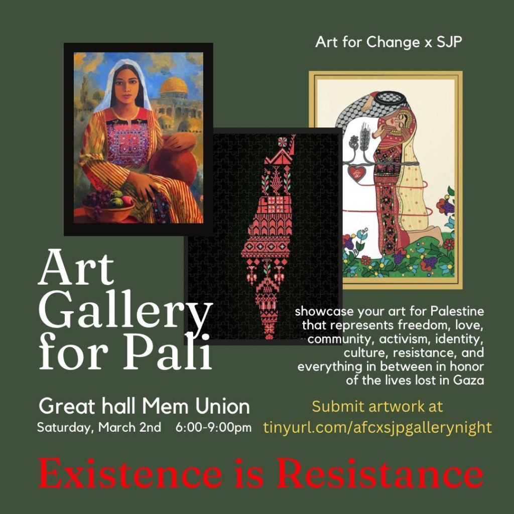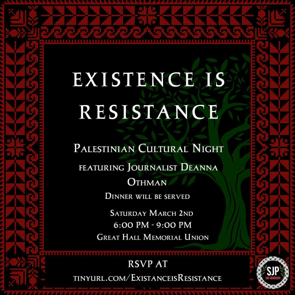 Categories Uncategorized Existence is Resistance Art Gallery for Palestine and Cultural Night March 2, 2024 at UW Madison Post author By wibailoutpeople Post date February 29, 2024 Existence is Resistance: Art Show Added 6-9 pm, Great Hall UW Memorial Union, Langdon Street, Madison Share this: Click to share on X (Opens in new window) X Click to share on Facebook (Opens in new window) Facebook Like Loading... Related ← Before and Beyond Vietnam → ‘Free Palestine!’ – Final Words of US Soldier before Self-Immolation in Protest of Gaza Genocide (VIDEO)