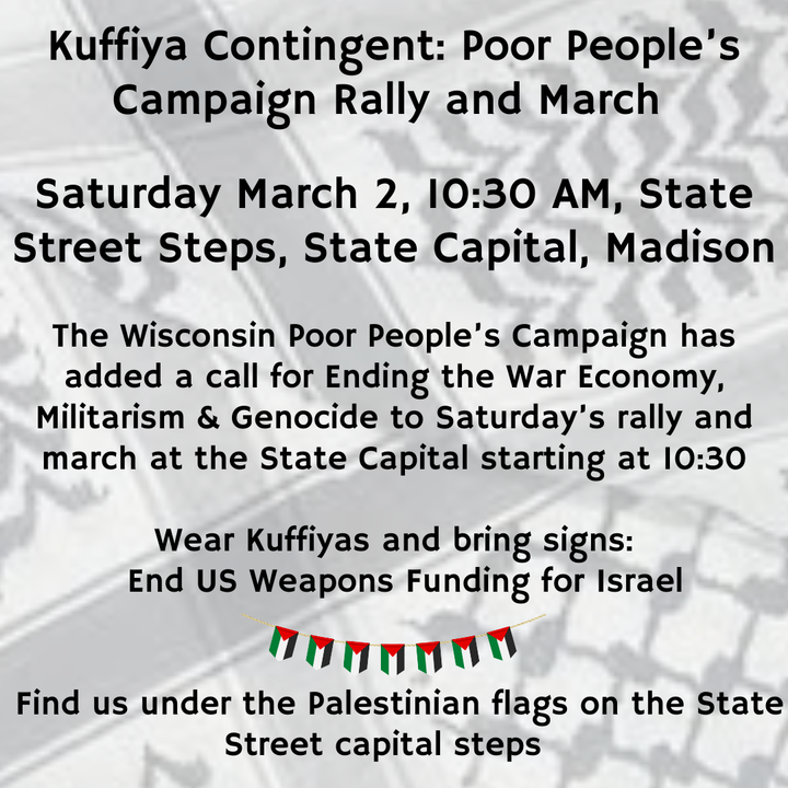 Here’s what we’re buying: Israel’s bombardment of Gaza has killed over 30,000 people in 5 months, including 12,660 children. Israel is now preparing to invade Rafah, a 25 square mile area at the southern end of Gaza where 1.5 million people are now sheltering in hospitals, schools and tents. Please join us in demanding that US funding for Israel’s military be redirected to human needs and insist that the Biden administration call for No Ground Invasion of Rafah.Learn more HERE https://www.poorpeoplescampaign.org, and join us in Madison