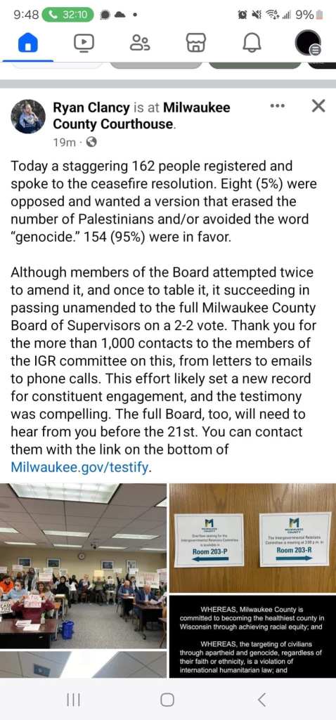Categories Uncategorized Hundreds Pack the Milwaukee County Courthouse to Demand a Board Ceasefire Resolution Post author By wibailoutpeople Post date March 5, 2024 Share this: Share on X (Opens in new window) X Share on Facebook (Opens in new window) Facebook Like Loading... Related ← Madison, March 6, 2024: War Criminals Not Welcome in Wisconsin! – Protest VP Kamala Harris – End all U.S. Aid to Apartheid Israel! – Reparations for Palestine Now! → Wisconsin LGBTQ History Project