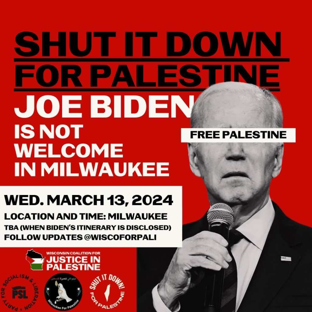 Categories Uncategorized Protest Genocide Joe Biden in Milwaukee March 13, 2024 – End All U.S. Aid to Apartheid Israel! – Stop the Genocide! – Free Palestine! Post author By wibailoutpeople Post date March 11, 2024 Wisconsin Coalition for Justice in Palestine @wiscoforpali Share this: Share on X (Opens in new window) X Share on Facebook (Opens in new window) Facebook Like Loading... Related ← Solidarity with Madison Educators! – Union, Yes! → Madison, March 13, 2024: Banners Up for Palestine!
