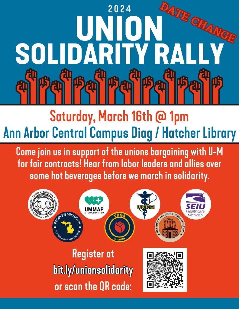 Categories Uncategorized Ann Arbor: Rally to Support UM Workers – March 16, 2024 Post author By wibailoutpeople Post date March 12, 2024 The UM labor and campus community is gathering in support of the many unions (including 3 AFT Michigan locals) currently negotiating new contracts. The rally will take place at UM Central campus diag at 1pm on Saturday, March 16. Share this: Share on X (Opens in new window) X Share on Facebook (Opens in new window) Facebook Like Loading... Related ← Michigan Nurses Association Informational Picket March 12, 2024 in Sault Saint Marie → Milwaukee, March 13, 2024: PROTEST GENOCIDE JOE BIDEN! – MONEY FOR PEOPLE’S NEEDS NOT THE ENDLESS U.S. WAR MACHINE! – STOP ISRAELI APARTHEID!