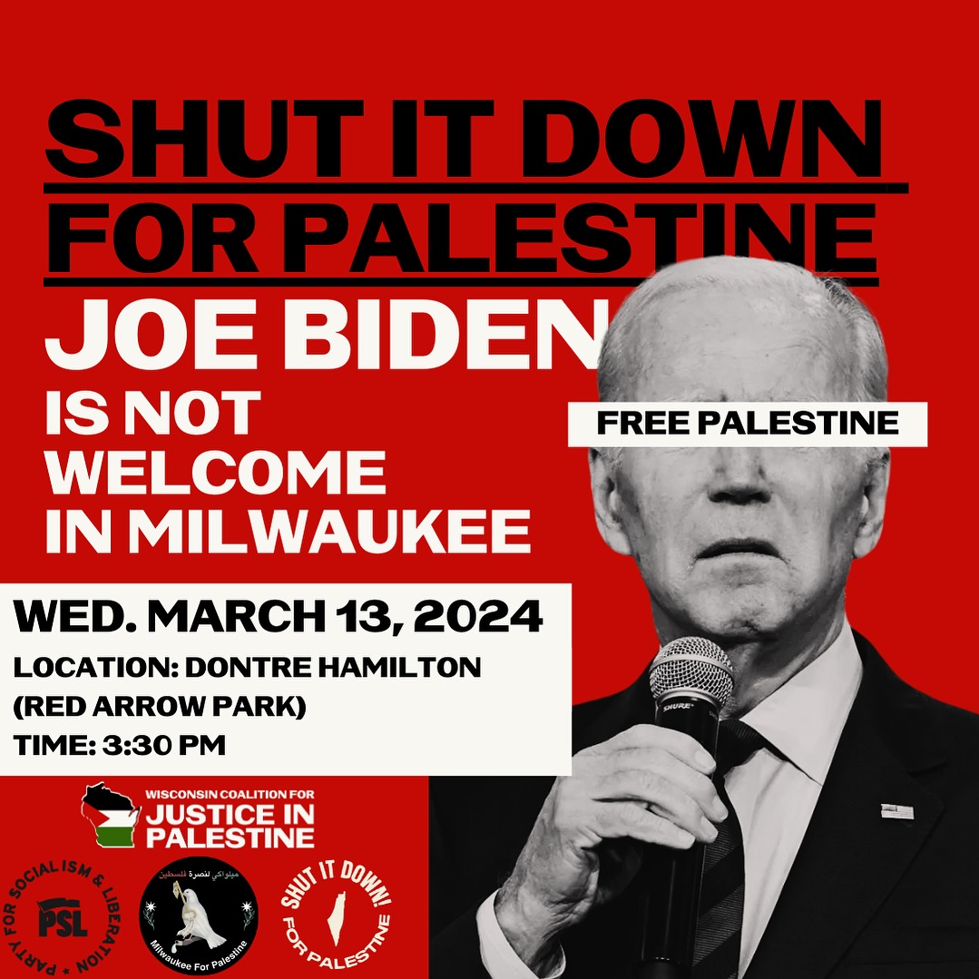 Meet in Red Arrow Park (Dontre Hamilton Park) at 3:30 p.m. Wednesday, March 13, 2024 to tell Biden’s motorcade we need a permanent ceasefire now and an end to genocide! Demonstration will last till about 5:30. Biden is going from Boys and Girls Club at 6th and Cherry to MSOE and then to Pfister.