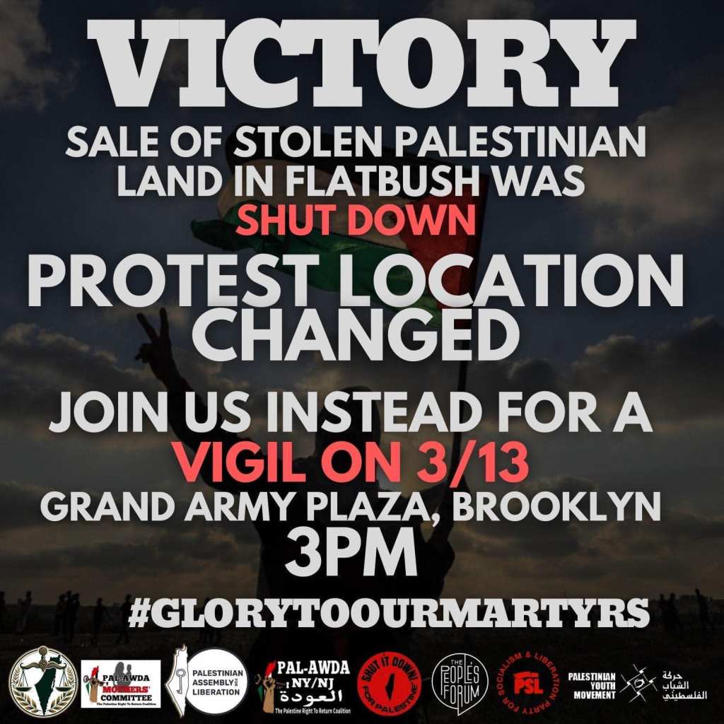 Categories Uncategorized Victory: Sale of Stolen Palestinian Land in Flatbush was SHUT DOWN! Post author By wibailoutpeople Post date March 13, 2024 Share this: Click to share on X (Opens in new window) X Click to share on Facebook (Opens in new window) Facebook Like Loading... Related ← Richmond highway blockade ups the ante in support for Palestine → Call to Artists & Artisans: Donate Your Work for Silent Art Auction for Humanitarian Aid to Gaza