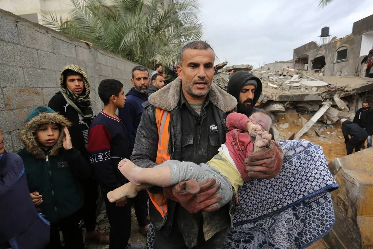 The lifeless body of a Palestinian baby is pulled from the rubble during search and rescue operations in the ruins of the house of the Palestinian Kannin family, which collapsed as a result of Israeli attacks on Deir Al-Balah, Gaza on March 7, 2024. [Ashraf Amra – Anadolu Agency]